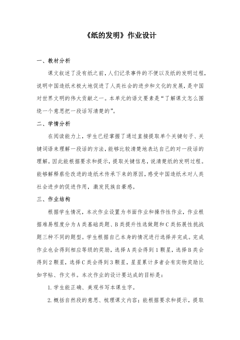 《纸的发明》作业设计一、教材分析课文叙述了没有纸之前,人们记录事件的不便以及纸的发明过程,说明中国造纸术极大地促进了人类社会的进步和文化的发展,是中国对世界文明的伟大贡献之一。本单元的语文要素是“了解课文怎么围绕一个意思把一段话写清楚的”。二、学情分析在阅读能力上,学生已经掌握了通过直接提取单个关键句子、关键词语来理解一段话的方法,能够比较清楚地表达自己的对一段话的理解。因此能根据要求和提示,提取关键信息,说清楚纸的发明过程。能够解释蔡伦改进的造纸术传承下来的原因,感受中国造纸术对人类社会进步的促进作用,激发民族自豪感。三、作业结构根据学生情况,本次作业设置为书面作业和操作性作业,作业根据难易程度分为A类基础类题、B类提升性选做题和C类拓展性挑战题三种不同的题型。学生根据自己本身的情况进行选择并完成。完成作业也会得到相应等级的奖励,选择A类会得到1颗星,选择B类会得到2颗星,选择C类会得到3颗星,星星累计多者会有实物奖励比如字帖、作文书。本次作业的设计要达成的目标是:1.学生能正确、美观书写本课生字。2.概括自然段的意思、梳理课文内容;能根据要求和提示,提取