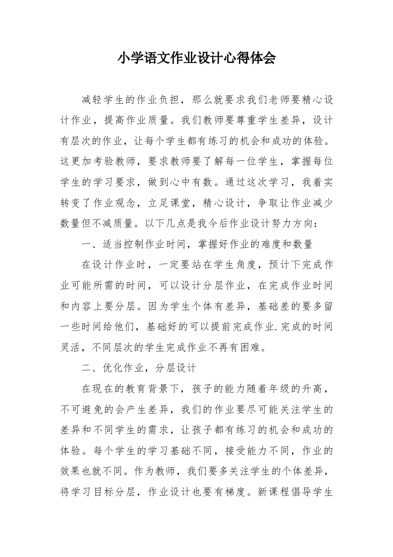 小学语文作业设计心得体会减轻学生的作业负担,那么就要求我们老师要精心设计作业,提高作业质量。我们教师要尊重学生差异,设计有层次的作业,让每个学生都有练习的机会和成功的体验。这更加考验教师,要求教师要了解每一位学生,掌握每位学生的学习要求,做到心中有数。通过这次学习,我着实转变了作业观念,立足课堂,精心设计,争取让作业减少数量但不减质量。以下几点是我今后作业设计努力方向:一、适当控制作业时间,掌握好作业的难度和数量在设计作业时,一定要站在学生角度,预计下完成作业可能所需的时间,可以设计分层作业,在完成作业时间和内容上要分层。因为学生个体有差异,基础差的要多留一些时间给他们,基础好的可以提前完成作业.完成的时间灵活,不同层次的学生完成作业不再有困难。二、优化作业,分层设计在现在的教育背景下,孩子的能力随着年级的升高,不可避免的会产生差异,我们的作业要尽可能关注学生的差异和不同学生的需求,让孩子都有练习的机会和成功的体验。每个学生的学习基础不同,接受能力不同,作业的效果也就不同。作为教师,我们要多关注学生的个体差异,将学习目标分层,作业设计也要有梯度。新课程倡导学生