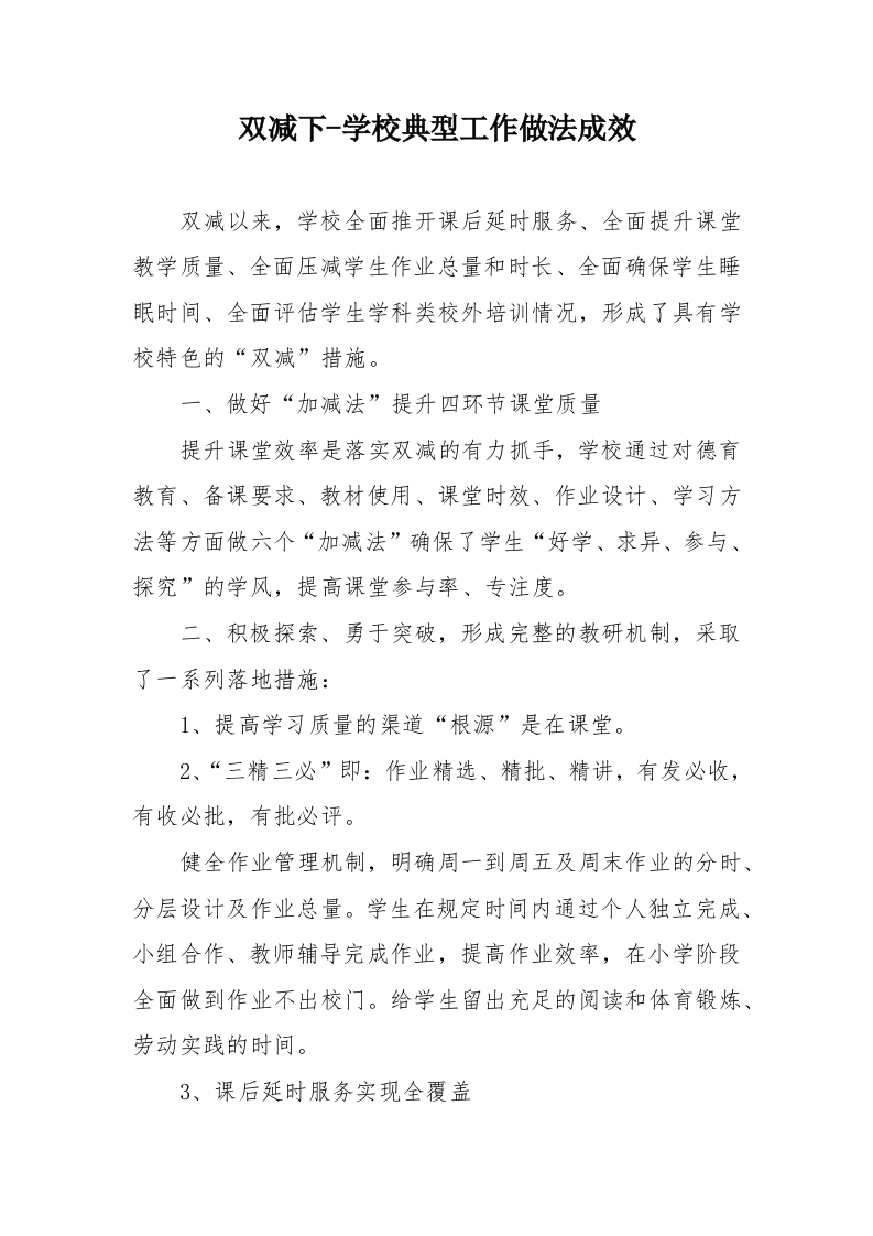 双减下-学校典型工作做法成效双减以来,学校全面推开课后延时服务、全面提升课堂教学质量、全面压减学生作业总量和时长、全面确保学生睡眠时间、全面评估学生学科类校外培训情况,形成了具有学校特色的“双减”措施。一、做好“加减法”提升四环节课堂质量提升课堂效率是落实双减的有力抓手,学校通过对德育教育、备课要求、教材使用、课堂时效、作业设计、学习方法等方面做六个“加减法”确保了学生“好学、求异、参与、探究”的学风,提高课堂参与率、专注度。二、积极探索、勇于突破,形成完整的教研机制,采取了一系列落地措施:1、提高学习质量的渠道“根源”是在课堂。2、“三精三必”即:作业精选、精批、精讲,有发必收,有收必批,有批必评。健全作业管理机制,明确周一到周五及周末作业的分时、分层设计及作业总量。学生在规定时间内通过个人独立完成、小组合作、教师辅导完成作业,提高作业效率,在小学阶段全面做到作业不出校门。给学生留出充足的阅读和体育锻炼、劳动实践的时间。3、课后延时服务实现全覆盖