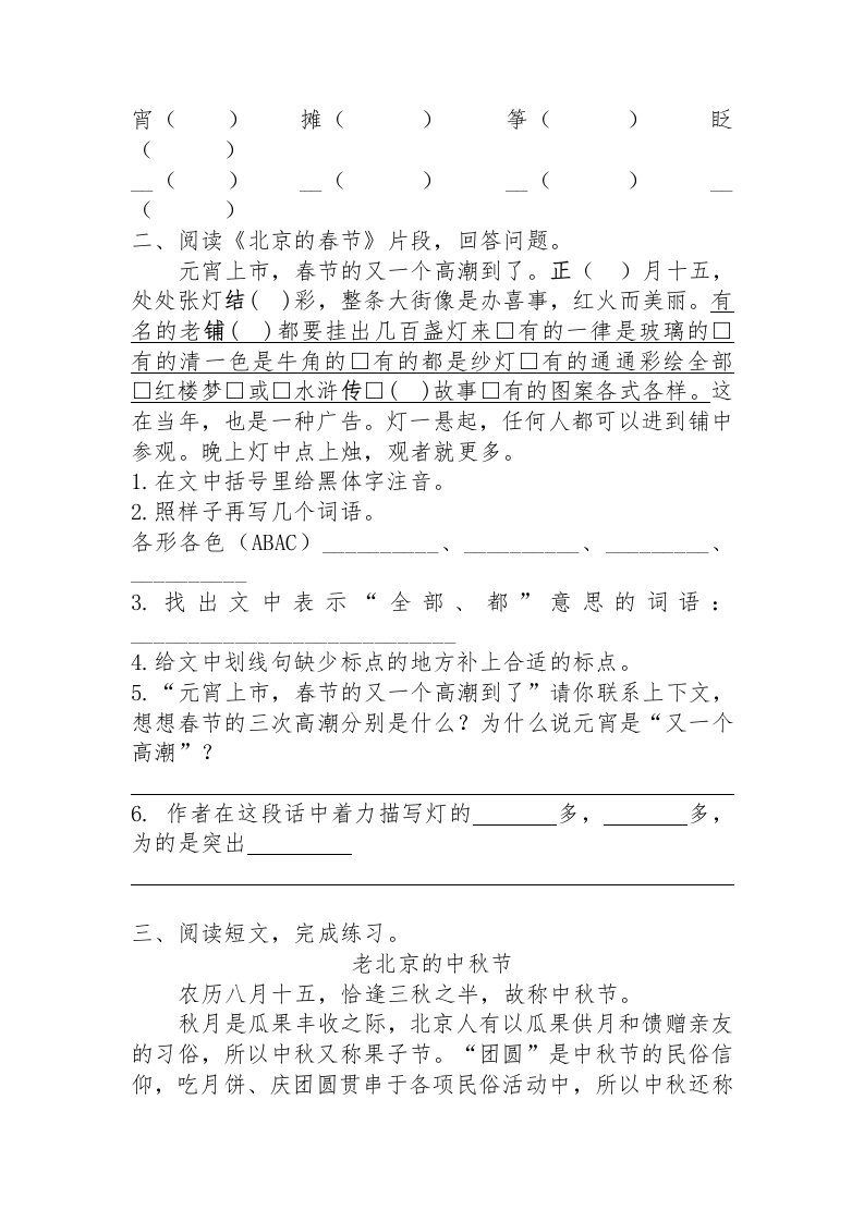 六年级下册第一课《北京的春节》作业设计一、教材分析:《北京的春节》是著名的语言大师老舍先生1951年创作的一篇散文。他用朴素自然、京味浓郁的语言,描绘了一幅老北京春节的民俗画卷,展示了中国节日习俗的温馨和美好,表达了人们辞旧迎新的美好期盼。文章以时间为经线,以人们的活动为纬线编织全文。作者先介绍北京的春节从腊月初旬就开始了:人们熬腊八粥、泡腊八蒜、购买年货、过小年…做好过春节的充分准备。紧接着,详细描述过春节的三次高潮:除夕夜家家灯火通宵,鞭炮声日夜不绝,吃团圆饭、守岁;初一男人们外出拜年,女人们在家接待客人,小孩逛庙会;十五观花灯、放鞭炮、吃元宵。最后写正月十九春节结束。文中列举了大量的老北京过春节的习俗,情趣盎然。全文内容安排有序,脉络清晰,衔接紧密,详略得当。语言表达朴实简洁,生动形象,耐人寻味,字里行间处处透出人们过春节的喜悦心情,反映出老北京人热爱生活的美好心愿。二、学情分析:春节这一传统民俗,同学们有丰富的生活体验,然而对于老北京人怎么过春节,学生了解的并不多,所以有浓厚的学习兴趣,但由于基础不同、学习习惯不同,学生的学习水平还是参差不齐。我们班的学生主要分三个层次:第一个层次的学生有着良好的学习习惯和较强的理解接受能力,学习主动性较强,;第二个层次的学生,他们有良好的学习习惯,能按时完成老师布置的作业,但对自己的要求不是特别高,处于中等水平。第三个层次的学生没有养成良好的学习习惯,再加上基础知识不够扎实,需要提升的空间还有很多。一、换偏旁写新字,再组词。醋()燃(饺(拌