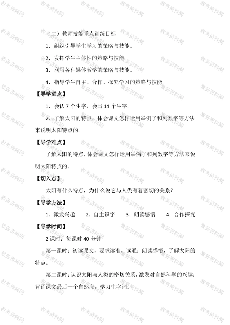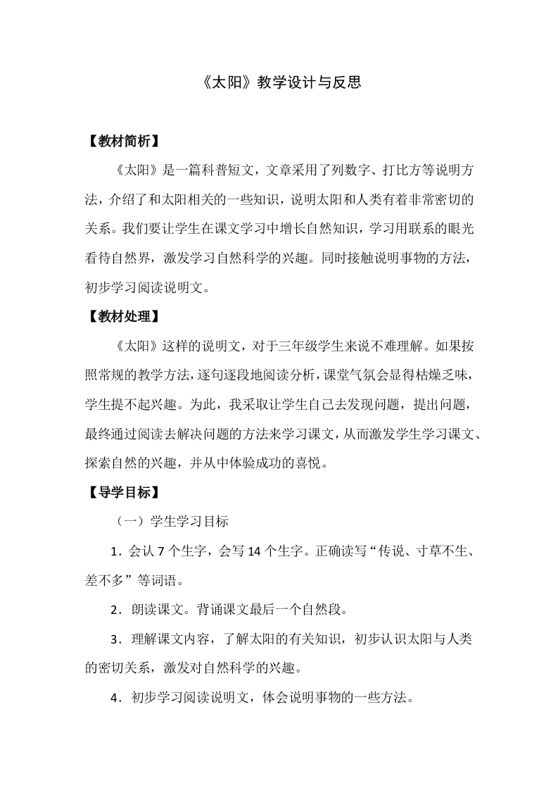 《太阳》教学设计与反思【教材简析】《太阳》是一篇科普短文,文章采用了列数字、打比方等说明方法,介绍了和太阳相关的一些知识,说明太阳和人类有着非常密切的关系。我们要让学生在课文学习中增长自然知识,学习用联系的眼光看待自然界,激发学习自然科学的兴趣。同时接触说明事物的方法,初步学习阅读说明文。【教材处理】《太阳》这样的说明文,对于三年级学生来说不难理解。如果按照常规的教学方法,逐句逐段地阅读分析,课堂气氛会显得枯燥乏味,学生提不起兴趣。为此,我采取让学生自己去发现问题,提出问题,最终通过阅读去解决问题的方法来学习课文,从而激发学生学习课文、探索自然的兴趣,并从中体验成功的喜悦。【导学目标】(一)学生学习目标1.会认7个生字,会写14个生字。正确读写“传说、寸草不生、差不多”等词语。2.朗读课文。背诵课文最后一个自然段。3,理解课文内容,了解太阳的有关知识,初步认识太阳与人类的密切关系,激发对自然科学的兴趣。4.初步学习阅读说明文,体会说明事物的一些方法。