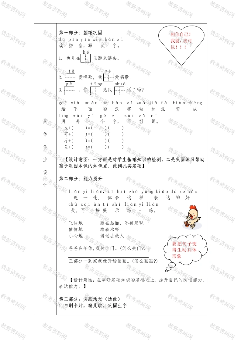 优秀作业设计学科小学语文年级一年级作业设计主题《小公鸡和小鸭子》《小公鸡和小鸭子》是一篇童话。课文讲的是小公鸡和小鸭子一起玩,小公鸡捉虫给小鸭子吃、小鸭子在小公鸡落水时救小公鸡的故事。层次清晰,叙事完整、情节生动、字里行间表达着伙伴间互相帮助、友好相处的情感。全文共有四个自然段,配有两幅插图。第1自然段交代了小公鸡和小鸭子一块儿出去玩,为后面的互相帮助作铺垫:第24自然段分别写了发生在草地里、小河边、水里的三个场景,草地里小公鸡捉虫给小鸭子吃,小河边小公鸡作想跟着小鸭子下水捉鱼,水里小鸭子救业教材分析起落水的小公鸡。本文词句学习的内容比较丰富,联设系上下文了解词语的意思是学习的重计点。了解“偷偷地、飞快地”等词语的意思,体会加上描述动作情状的词语能意使句子更生动形象:另外“吃得很欢、图急得直哭”等词语也是积累的内容,“吃得很欢”的“欢”也可以通过联系上下文来了解意思。本文是学习朗读对话的好材料,课文小公鸡和小鸭子的对话主要集中在第3自然段,这段文字内容筒单、清晰,口语化强情境完整,适合低年级学生进行对话朗读练习。本文的体裁是童话,孩子比较感兴趣阅读,而一年级孩子的阅读能力还不学情分析强,对阅读有一定的抵触心理,而本文文字内容筒单、清晰,口语化强情境完整,适合低年级学生进行对话朗读习。1.基础巩固作业结构2.能力提升3.实践活动【选做】1.基础巩固【10分钟】作业总量2.能力提升【10分钟】3.实践活动【选做】