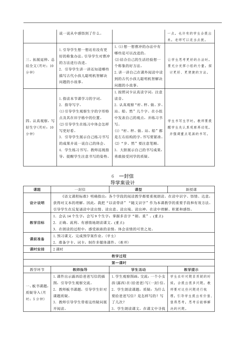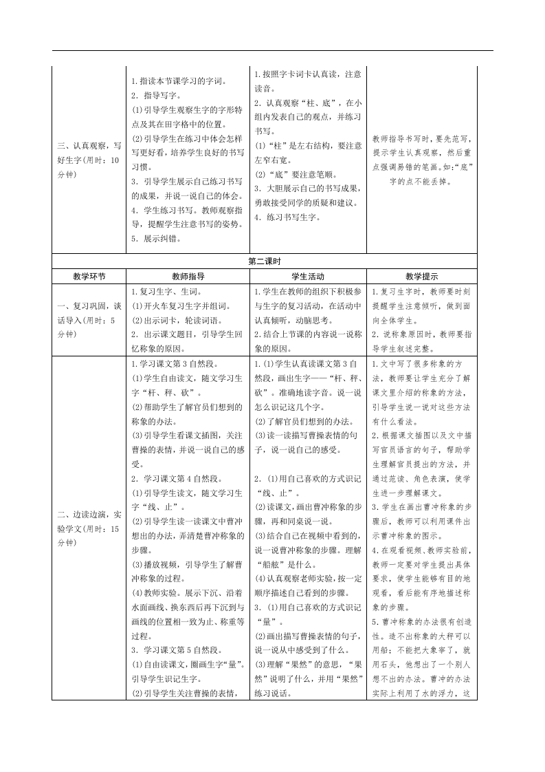 4曹冲称象导学案设计课题曹冲称象课型新授课《曹冲称象》讲的是一个经典的历史故事,课文按照“遇难题→议办法→讲步骤”的思路展开,表现了曹冲的聪明机智,给人以深刻的启迪。本课导学案设计注重学生的参与,把握时机调动学生学习的主动性和积极性,充分发挥学生的主体作用,让学生在识字、品文的过程中,设计说明创新精神及实践能力得到培养。在突破教学难点的学习中,运用角色模拟及直观试验的方法,使抽象的文字具体化,帮助学生理解曹冲称象的具体方法和步骤。听、说、读、写的练习可以使学生在交流中体会探究的快乐,从而培养学生的观察能力和思维方法。1.认识14个生字:会写9个字:结合句子理解“直”和“才”的意思。(重点)2.正确、流利地朗读课文(重点)。了解曹冲称象的方法,知道这个方法好在哪儿(难点)。能读出教学目标人物对话所表达的意思(难点)3.能从曹冲称象的故事中受到启发。(难点)4.通过学习曹冲称象的故事,懂得遇到问题要普于动脑筋的道理。课前准备1.制作多媒体课件。(教师)2.预习字词,朗读课文。(学生)课时安排2课时教学过程第一课时教学环节教师指导学生活动教学提示1.结合生活经验说出自己想到1.叙述称象的方法对学生来1.出示苹果,引导学生思考:想的方法。说会有一定的困难,教师可知道苹果的重量怎么办?一、图片激趣,导2.学生自由说称象的办法。2.引导学生思考怎么称大象的以用课件让学生了解可以称入新课(用时:103.用自己喜欢的方法识记生字较重物体的秤。重量。分钟)并组词。2.“称”是多音字,教师要3.板书课文趣目,生齐读课文“称”是多音字,可以扩展引导学生通过组词理解不同趣目。学习“曹、称”两个字。识记。读音表示的不同含义。1.自由读文,一边读一边用自1.引导学生用自己喜欢的方式己喜欢的方式圈画生字。读课文并圈画生字。1.对于文中出现的人物,教2.读课文第1自然段。2.学习课文第1自然段。师可以进行简单的介绍,从(1)了解课文中出现的人物:曹(1)指名读课文。说一说课文中而帮助学生了解谋文。操、曹冲、官员们都有哪些人物。引导学生随文识2.学生画出描写大象样子的(2)说一说生字的特点,再说一记字词:重、官员、议论。句子后,教师可以把重点词说自己识记的方法,并轮流读二、初步读文,自(2)引导学生质疑,提出还有哪语标出来,然后再进行词语学生字(用时:20词卡。些词语不太理解。3.认真读课文,画出描写大象积累,使学生进一步了解这分钟)3.学习课文第2自然段。是一头怎样的大象。的句子。(1)多种形式读课文。随文识记3.通过学生练习说话,教师“根”“柱”。引导学生进行语(1)练习用“又…又…”说纠正,帮助学生理解“一言的积累训练,并了解这是一头话。边一边…”的含义(两(2)理解“一边……一怎样的大象。件事情可以同时进行而不互边…”(2)小组合作,情景表演。展现相干扰)。的含义。官员们看者大象议论的场面。(3)小组合作,分角色演一演。