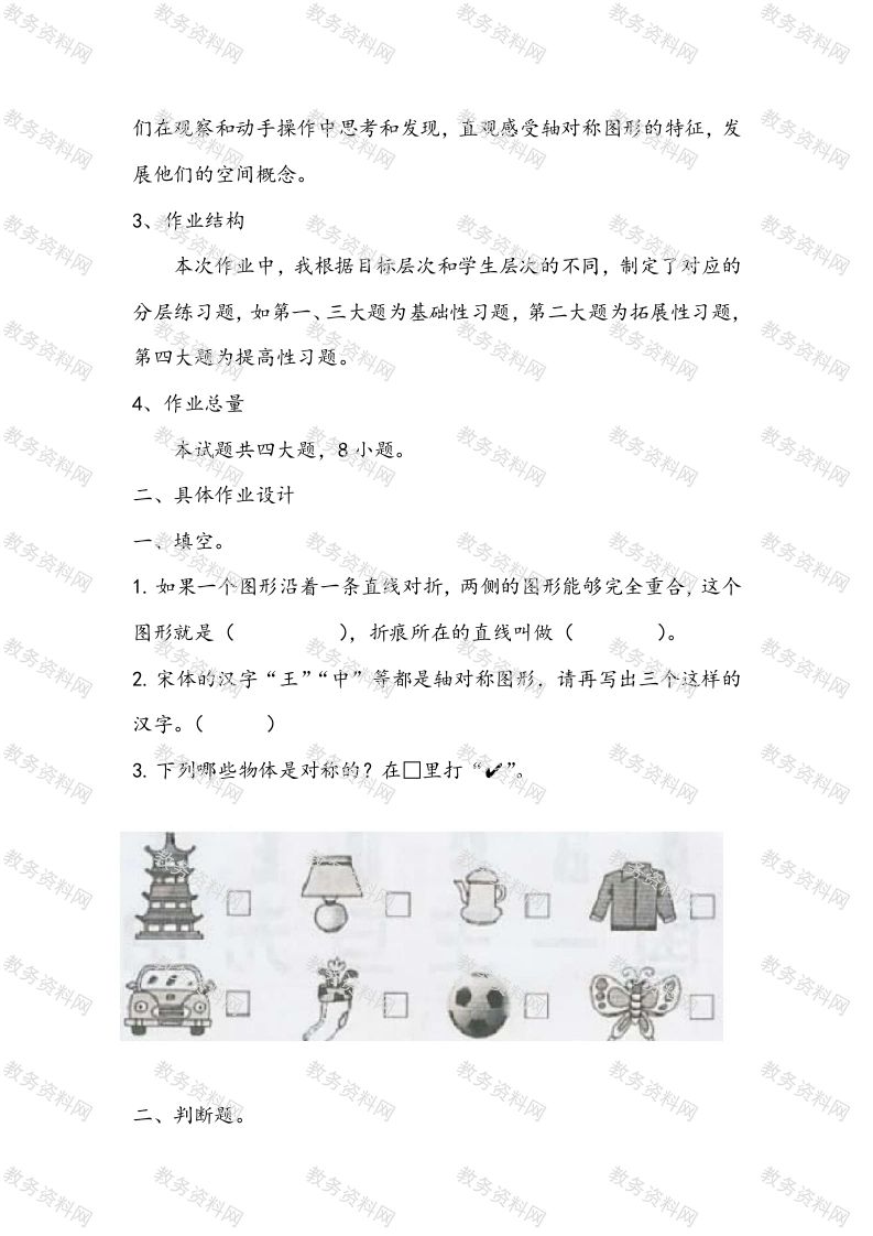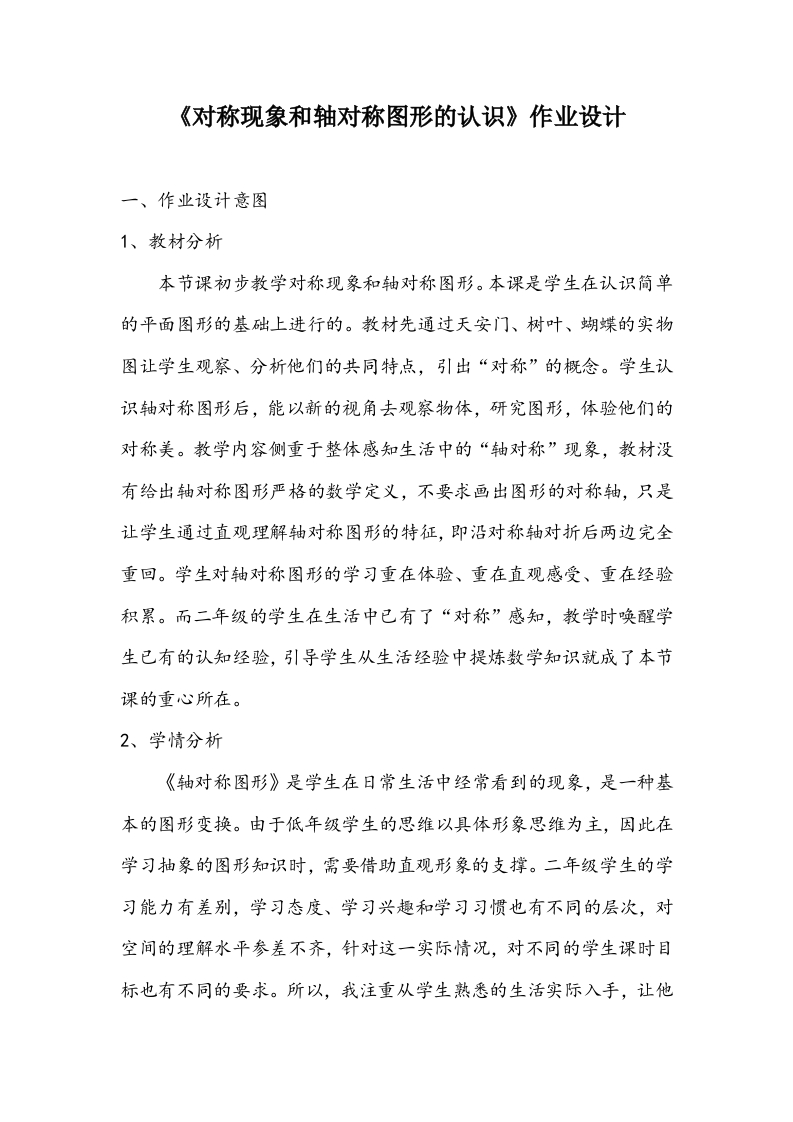 《对称现象和轴对称图形的认识》作业设计一、作业设计意图1、教材分析本节课初步教学对称现象和轴对称图形。本课是学生在认识简单的平面图形的基础上进行的。教材先通过天安门、树叶、蝴蝶的实物图让学生观察、分析他们的共同特点,引出“对称”的概念。学生认识轴对称图形后,能以新的视角去观察物体,研究图形,体验他们的对称美。救学内容侧重于整体感知生活中的“轴对称”现象,教材没有给出轴对称图形严格的数学定义,不要求画出图形的对称轴,只是让学生通过直观理解轴对称图形的特征,即沿对称轴对折后两边完全重回。学生对轴对称图形的学习重在体验、重在直观感受、重在经验积累。而二年级的学生在生活中已有了“对称”感知,教学时唤醒学生已有的认知经验,引导学生从生活经验中提炼数学知识就成了本节课的重心所在。2、学情分析《轴对称图形》是学生在日常生活中经常看到的现象,是一种基本的图形变换。由于低年级学生的思维以具体形象思维为主,因此在学习抽象的图形知识时,需要借助直观形象的支撑。二年级学生的学习能力有差别,学习态度、学习兴趣和学习习惯也有不同的层次,对空间的理解水平参差不齐,针对这一实际情况,对不同的学生课时目标也有不同的要求。所以,我注重从学生熟悉的生活实际入手,让他