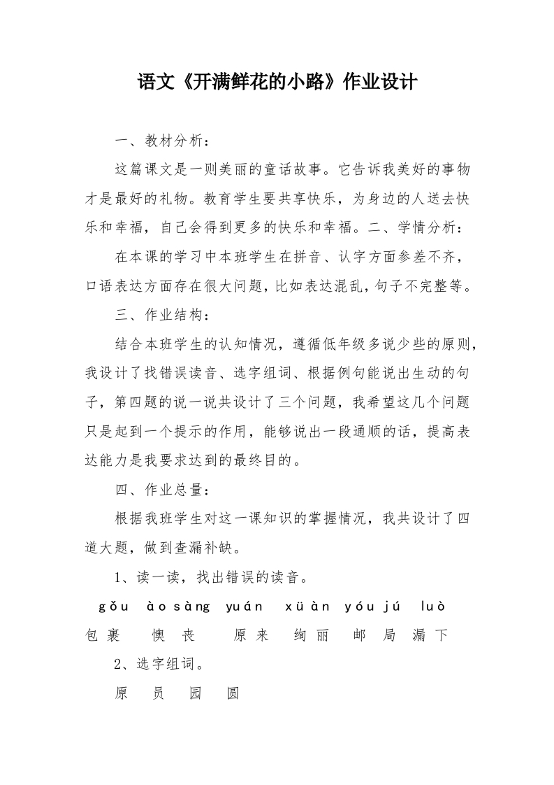 语文《开满鲜花的小路》作业设计一、教材分析:这篇课文是一则美丽的童话故事。它告诉我美好的事物才是最好的礼物。教育学生要共享快乐,为身边的人送去快乐和幸福,自己会得到更多的快乐和幸福。二、学情分析:在本课的学习中本班学生在拼音、认字方面参差不齐,口语表达方面存在很大问题,比如表达混乱,句子不完整等。三、作业结构:结合本班学生的认知情况,遵循低年级多说少些的原则,我设计了找错误读音、选字组词、根据例句能说出生动的句子,第四题的说一说共设计了三个问题,我希望这几个问题只是起到一个提示的作用,能够说出一段通顺的话,提高表达能力是我要求达到的最终目的。四、作业总量:根据我班学生对这一课知识的掌握情况,我共设计了四道大题,做到查漏补缺。1、读一读,找出错误的读音。gǒuàosàng yuan xuàny6ujúluò包裹懊丧原来绚丽邮局漏下2、选字组词。原员园圆