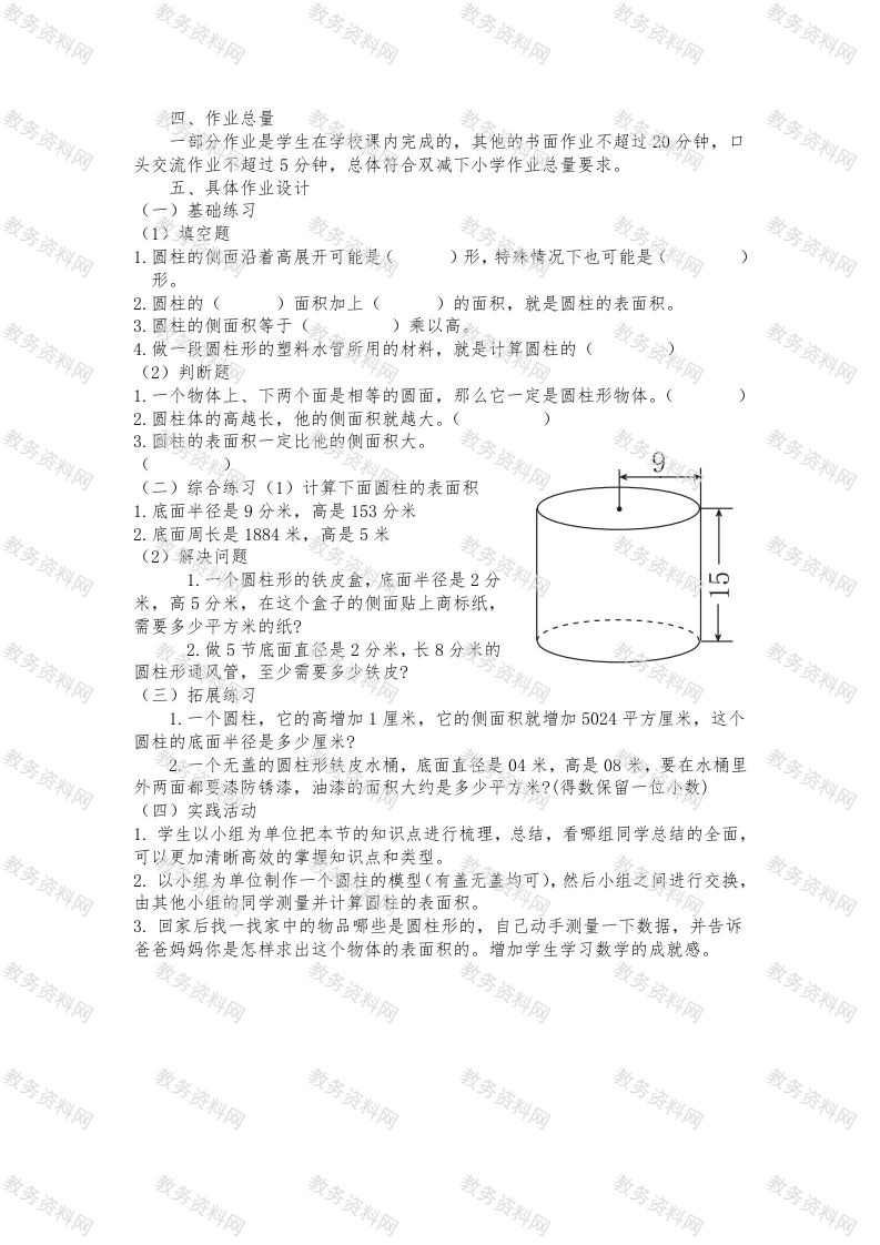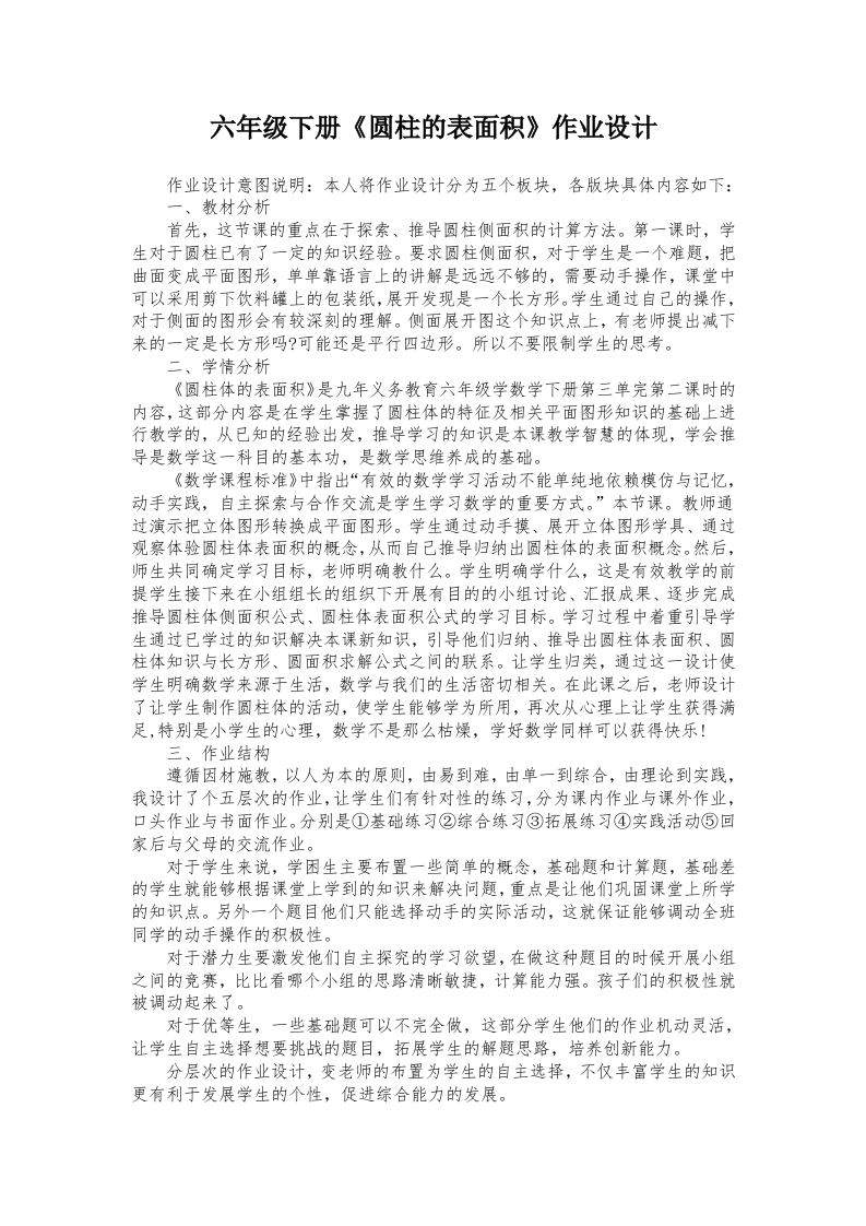 六年级下册《圆柱的表面积》作业设计作业设计意图说明:本人将作业设计分为五个板块,各版块具体内容如下:一、教材分析首先,这节课的重点在于探索、推导圆柱侧面积的计算方法。第一课时,学生对于圆柱已有了一定的知识经验。要求圆柱侧面积,对于学生是一个难题,把曲面变成平面图形,单单靠语言上的讲解是远远不够的,需要动手操作,课堂中可以采用剪下饮料罐上的包装纸,展开发现是一个长方形。学生通过自己的操作,对于侧面的图形会有较深刻的理解。侧面展开图这个知识点上,有老师提出减下来的一定是长方形吗?可能还是平行四边形。所以不要限制学生的思考。二、学情分析《圆柱体的表面积》是九年义务教育六年级学数学下册第三单完第二课时的内容,这部分内容是在学生掌握了圆柱体的特征及相关平面图形知识的基础上进行教学的,从已知的经验出发,推导学习的知识是本课教学智慧的体现,学会推导是数学这一科目的基本功,是数学思维养成的基础。《数学课程标准》中指出“有效的数学学习活动不能单纯地依赖模仿与记忆,动手实践,自主探索与合作交流是学生学习数学的重要方式。”本节课。教师通过演示把立体图形转换成平面图形。学生通过动手摸、展开立体图形学具、通过观察体验圆柱体表面积的概念,从而自己推导归纳出圆柱体的表面积概念。然后,师生共同确定学习目标,老师明确教什么。学生明确学什么,这是有效教学的前提学生接下来在小组组长的组织下开展有目的的小组讨论、汇报成果、逐步完成推导圆柱体侧面积公式、圆柱体表面积公式的学习目标。学习过程中着重引导学生通过已学过的知识解决本课新知识,引导他们归纳、推导出圆柱体表面积、圆柱体知识与长方形、圆面积求解公式之间的联系。让学生归类,通过这一设计使学生明确数学来源于生活,数学与我们的生活密切相关。在此课之后,老师设计了让学生制作圆柱体的活动,使学生能够学为所用,再次从心理上让学生获得满足,特别是小学生的心理,数学不是那么枯燥,学好数学同样可以获得快乐!三、作业结构遵循因材施教,以人为本的原则,由易到难,由单一到综合,由理论到实践,我设计了个五层次的作业,让学生们有针对性的练习,分为课内作业与课外作业,口头作业与书面作业。分别是①基础练习②综合练习③拓展练习④实践活动⑤回家后与父母的交流作业。对于学生来说,学困生主要布置一些筒单的概念,基础题和计算题,基础差的学生就能够根据课堂上学到的知识来解决问题,重点是让他们巩固课堂上所学的知识点。另外一个题目他们只能选择动手的实际活动,这就保证能够调动全班同学的动手操作的积极性。对于潜力生要激发他们自主探究的学习欲望,在做这种题目的时候开展小组之间的竞赛,比比看哪个小组的思路清晰敏捷,计算能力强。孩子们的积极性就被调动起来了。对于优等生,一些基础题可以不完全做,这部分学生他们的作业机动灵活,让学生自主选择想要挑战的题目,拓展学生的解题思路,培养创新能力。分层次的作业设计,变老师的布置为学生的自主选择,不仅丰富学生的知识更有利于发展学生的个性,促进综合能力的发展。