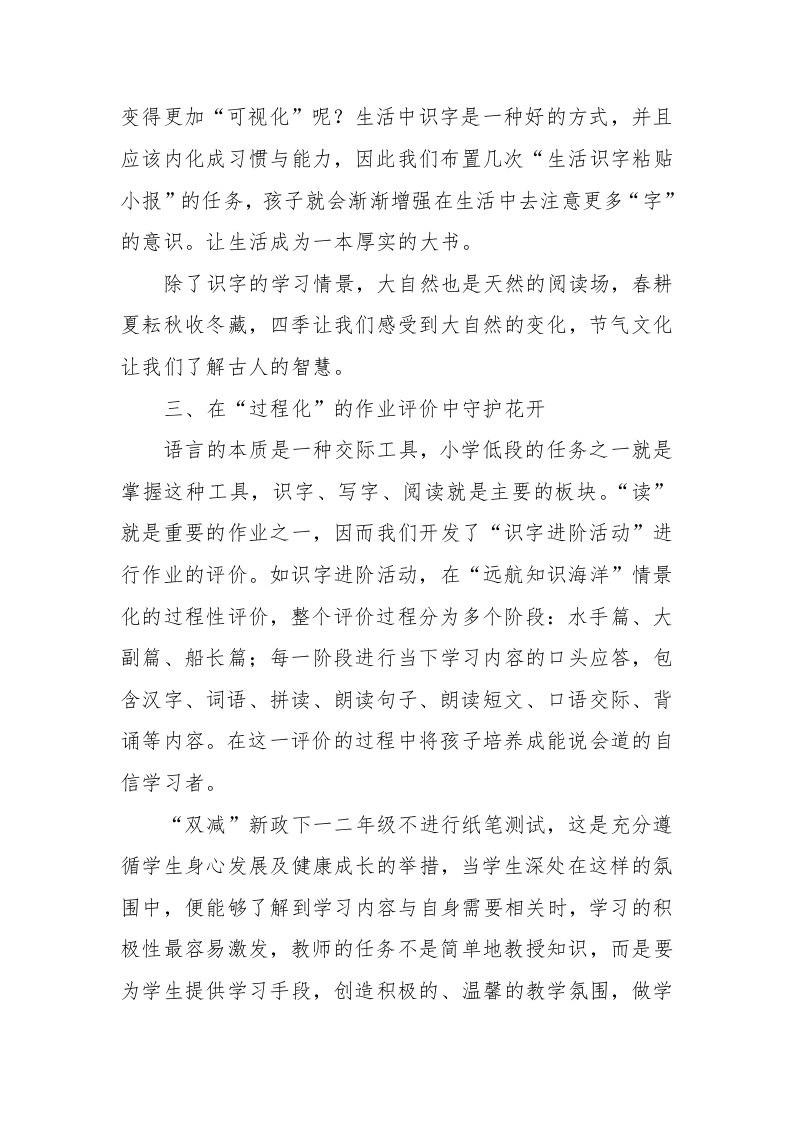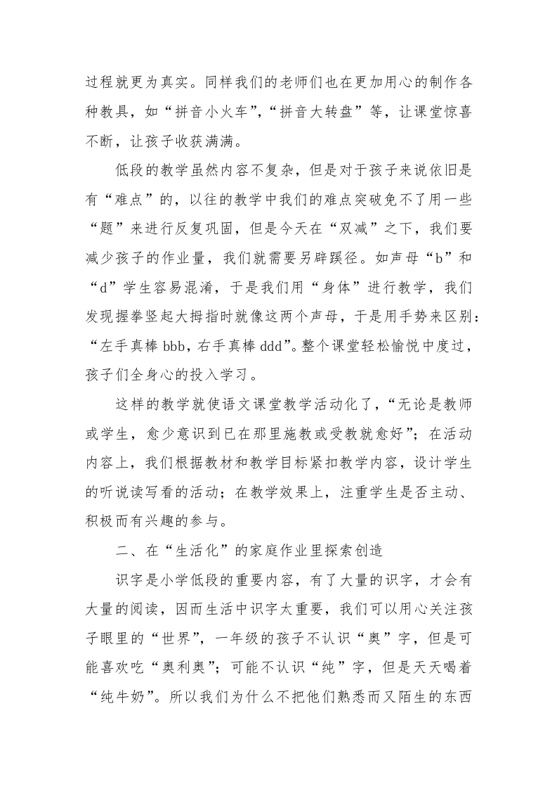双减政策下花样语文作业设计在过去的教学生涯中我们特别注重教学的“结果”,现在在新政下我们不再时刻想着做题,不再时刻想着分数,教育的脚步开始变得从容,因而真正地开始把重心转到了“过程”上来。一、在“活动化”的课堂作业中共生成长学习“拼音”是小学低段语文教学的第一阶段,这一阶段里学过的孩子轻松应对,没有学过的孩子则不能只以“多练习”作为学习方法了,当我们念口诀一般说着:“前音轻短后音重,两音相连猛一碰”时,我们重视“猛一碰”所发生的“化学反应”,而不单单是孩子跟着老师读的“记忆式”教学,“让孩子多去试错吧!”不断地在心里告诉自己,让孩子在尝试、探索中学习。与此同时创造多样的游戏情景让孩子练习拼读,我们探索出了许多关于拼读的游戏,如戴声调帽子“谁是a,我是a,aaa”,字母手牵手游戏“我是b,我是0,我们组成bo”等。“兴趣”对孩子而言尤为重要,小学低段制作出“花样”的教具和学具再与游戏一结合往往能起到事半功倍的效果,在教学实践中我们制作了许多字卡,探索出一系列的字卡游戏:1."字卡打牌"游戏。2.对对子游戏。3.找字游戏,在学具的加持之下,每个孩子的学习参与都非常充分,学习的