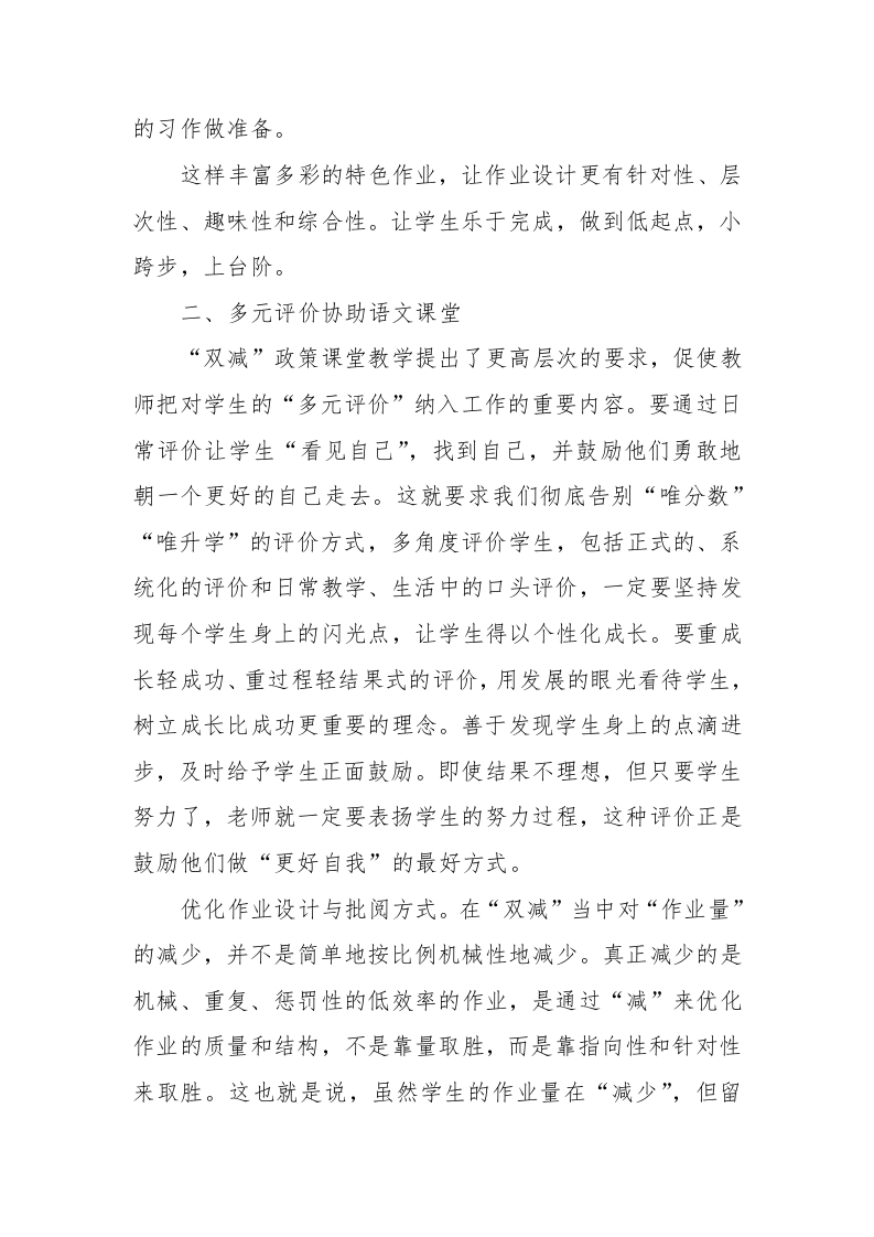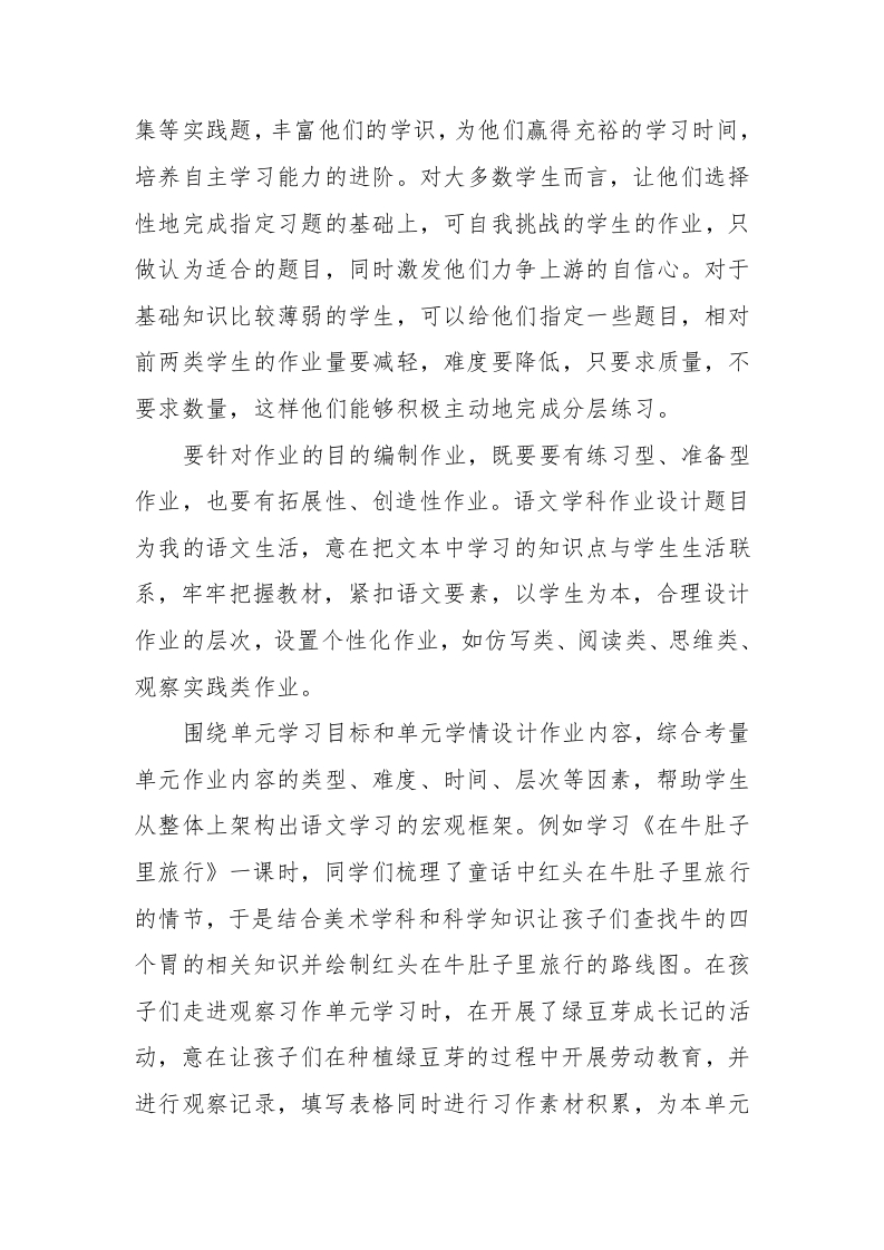 双减政策下减量不减质的语文作业设计要解决当前中小学作业量过多、质量不高、功能异化的问题,切实减轻学生作业负担,我们教师作为作业的设计者和评价者,持续优化作业实践从以下两个方面进行了作业设计。一、优化作业设计助力双减从低年级过渡到中高年级,学生积累逐渐增多。以前机械的记忆抄写学生兴趣低,有些同学甚至抵制抄写作业。老师通过提前备课,多学科融合进行深度构思,设计了玩转古诗的特色作业。例如学生进行古诗学习之后,通过理解绘画出古诗的意境,这样诗配画的形式让学生通过绘画理解古诗内容的同时积累古诗,学生很乐于完成。依据学习内容的逻辑关系、关注双基培养、主题拓展、实践体验等形式,从基础巩固到拓展延伸层层递进,帮助学生在起点水平上有所跃升。为了能够使每个学生乐学乐写,在作业布置中分清层次,使学生根据自己实际能力兴趣选择难度不同、类型各异的作业。我们把作业分为基础、拓展、延伸三个层次,作业采取“自助餐”的形式,如学有余力的的学生注重较多的是课外知识,因为这类学生学习能力较强,让他们在完成了指定习题的基础上,进行文章欣赏,资源收