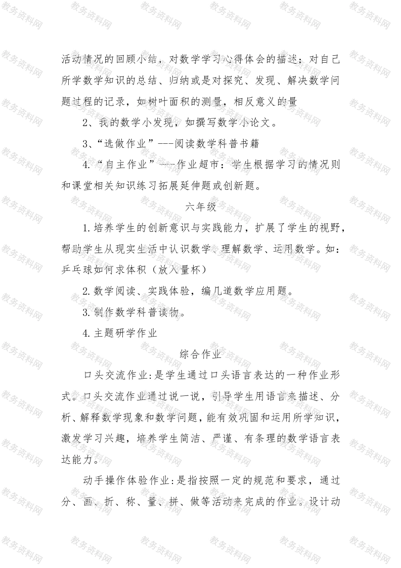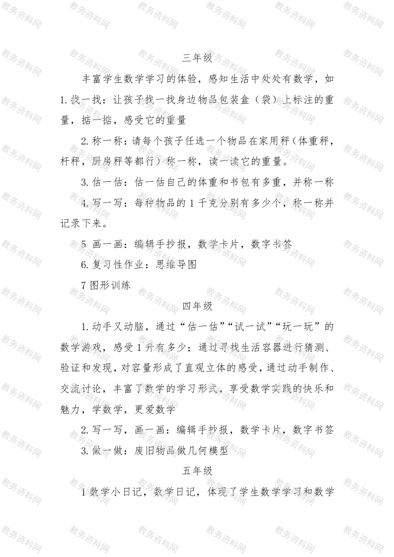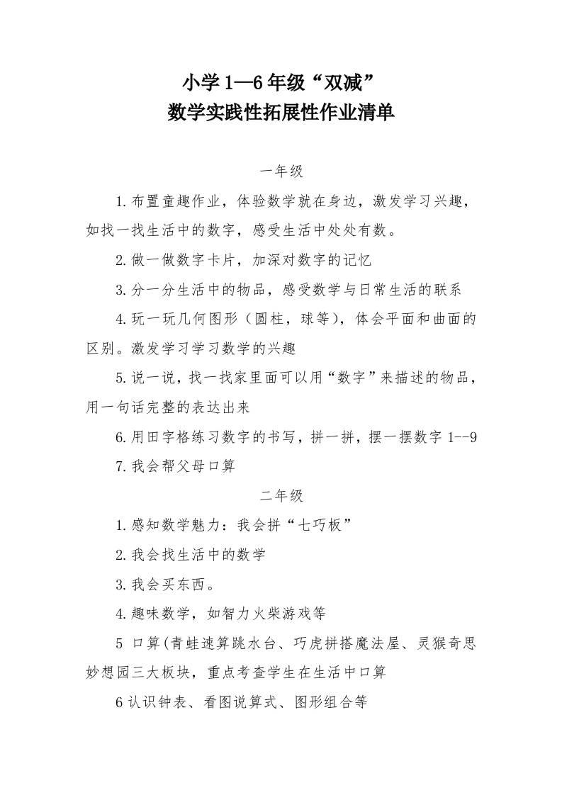 小学1一6年级“双减”数学实践性拓展性作业清单一年级1.布置童趣作业,体验数学就在身边,激发学习兴趣,如找一找生活中的数字,感受生活中处处有数。2.做一做数字卡片,加深对数字的记忆3.分一分生活中的物品,感受数学与日常生活的联系4.玩一玩几何图形(圆柱,球等),体会平面和曲面的区别。激发学习学习数学的兴趣5.说一说,找一找家里面可以用“数字”来描述的物品,用一句话完整的表达出来6.用田字格练习数字的书写,拼一拼,摆一摆数字1--97.我会帮父母口算二年级1.感知数学魅力:我会拼“七巧板”2.我会找生活中的数学3.我会买东西。4.趣味数学,如智力火柴游戏等5口算(青蛙速算跳水台、巧虎拼搭魔法屋、灵猴奇思妙想园三大板块,重点考查学生在生活中口算6认识钟表、看图说算式、图形组合等