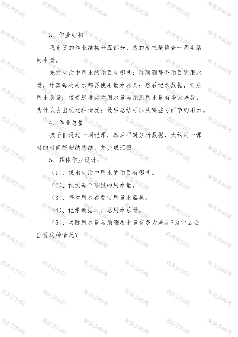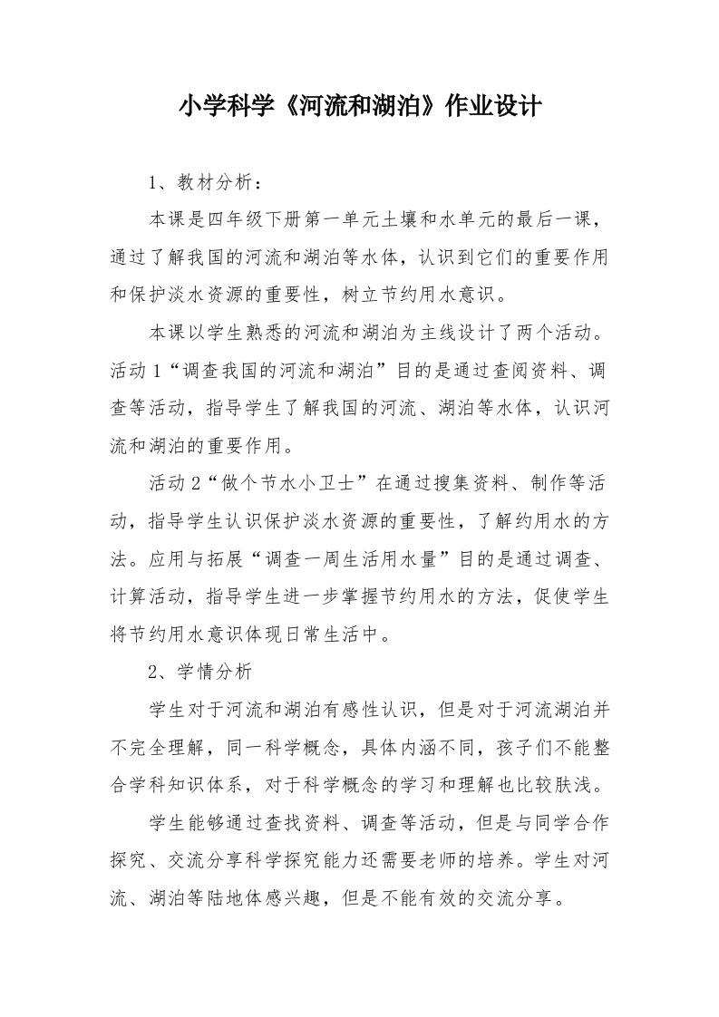 小学科学《河流和湖泊》作业设计1、教材分析:本课是四年级下册第一单元土壤和水单元的最后一课,通过了解我国的河流和湖泊等水体,认识到它们的重要作用和保护淡水资源的重要性,树立节约用水意识。本课以学生熟悉的河流和湖泊为主线设计了两个活动。活动1“调查我国的河流和湖泊”目的是通过查阅资料、调查等活动,指导学生了解我国的河流、湖泊等水体,认识河流和湖泊的重要作用。活动2“做个节水小卫士”在通过搜集资料、制作等活动,指导学生认识保护淡水资源的重要性,了解约用水的方法。应用与拓展“调查一周生活用水量”目的是通过调查、计算活动,指导学生进一步掌握节约用水的方法,促使学生将节约用水意识体现日常生活中。2、学情分析学生对于河流和湖泊有感性认识,但是对于河流湖泊并不完全理解,同一科学概念,具体内涵不同,孩子们不能整合学科知识体系,对于科学概念的学习和理解也比较肤浅。学生能够通过查找资料、调查等活动,但是与同学合作探究、交流分享科学探究能力还需要老师的培养。学生对河流、湖泊等陆地体感兴趣,但是不能有效的交流分享。