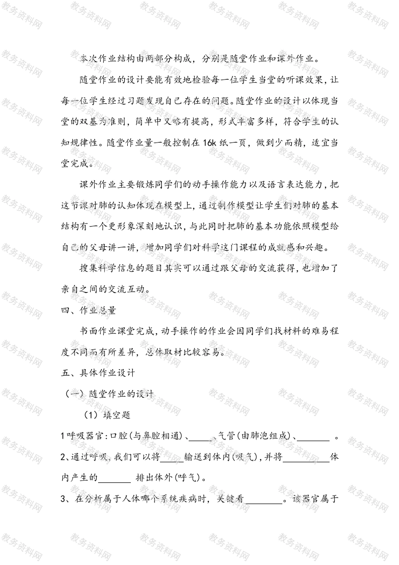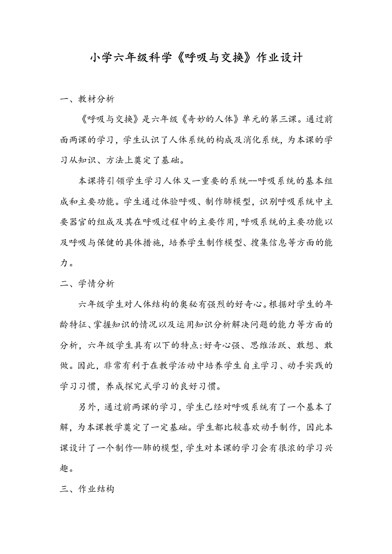 小学六年级科学《呼吸与交换》作业设计一、教材分析《呼吸与交换》是六年级《奇妙的人体》单元的第三课。通过前面两课的学习,学生认识了人体系统的构成及消化系统,为本课的学习从知识、方法上奠定了基础。本课将引领学生学习人体又一重要的系统一呼吸系统的基本组成和主要功能。学生通过体验呼吸、制作肺模型,识别呼吸系统中主要器官的组成及其在呼吸过程中的主要作用,呼吸系统的主要功能以及呼吸与保健的具体措施,培养学生制作模型、搜集信息等方面的能力。二、学情分析六年级学生对人体结构的奥秘有强烈的好奇心。根据对学生的年龄特征、掌握知识的情况以及运用知识分析解决问题的能力等方面的分析,六年级学生具有以下的特点:好奇心强、思维活跃、敢想、敢做。因此,非常有利于在教学活动中培养学生自主学习、动手实践的学习习惯,养成探究式学习的良好习惯。另外,通过前两课的学习,学生已经对呼吸系统有了一个基本了解,为本课教学奠定了一定基础。学生都比较喜欢动手制作,因此本课设计了一个制作一肺的模型,学生对本课的学习会有很浓的学习兴趣。三、作业结构