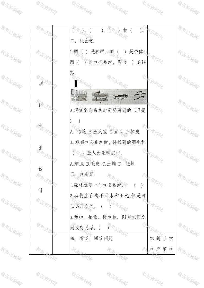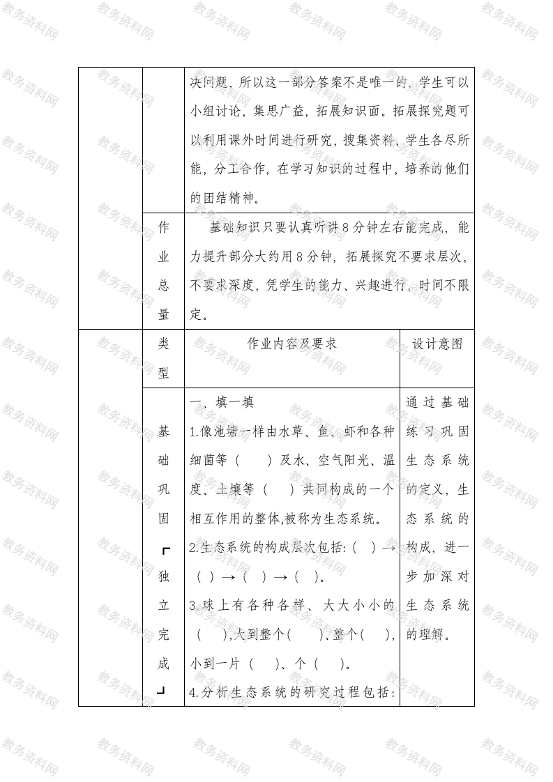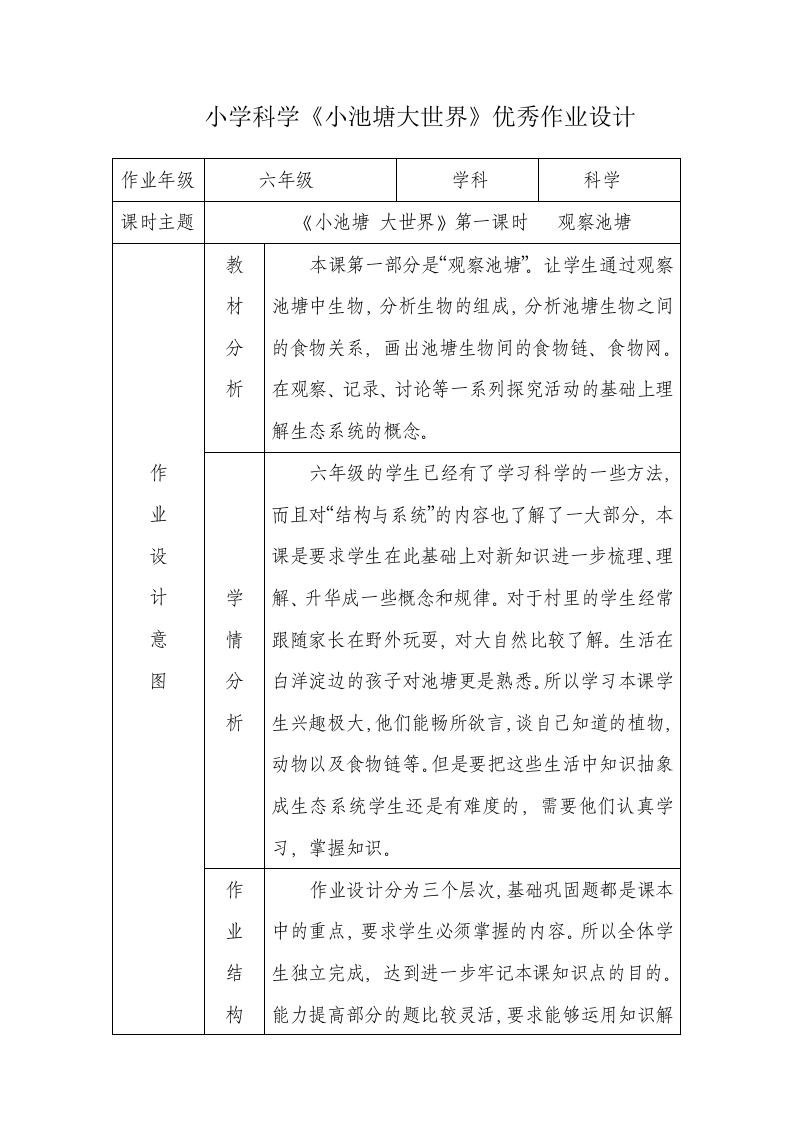 小学科学《小池塘大世界》优秀作业设计作业年级六年级学科科学课时主题《小池塘大世界》第一课时观察池塘教本课第一部分是“观察池塘”。让学生通过观察材池塘中生物,分析生物的组成,分析池塘生物之间分的食物关系,画出池塘生物间的食物链、食物网。析在观察、记录、讨论等一系列探究活动的基础上理解生态系统的概念。作六年级的学生已经有了学习科学的一些方法,业而且对“结构与系统”的内容也了解了一大部分,本设课是要求学生在此基础上对新知识进一步梳理、理计学解、升华成一些概念和规律。对于村里的学生经常意情跟随家长在野外玩要,对大自然比较了解。生活在图分白洋淀边的孩子对池塘更是熟悉。所以学习本课学析生兴趣极大,他们能畅所欲言,谈自己知道的植物,动物以及食物链等。但是要把这些生活中知识抽象成生态系统学生还是有难度的,需要他们认真学习,掌握知识。作作业设计分为三个层次,基础巩固题都是课本业中的重点,要求学生必须掌握的内容。所以全体学结生独立完成,达到进一步牢记本课知识点的目的。构能力提高部分的题比较灵活,要求能够运用知识解