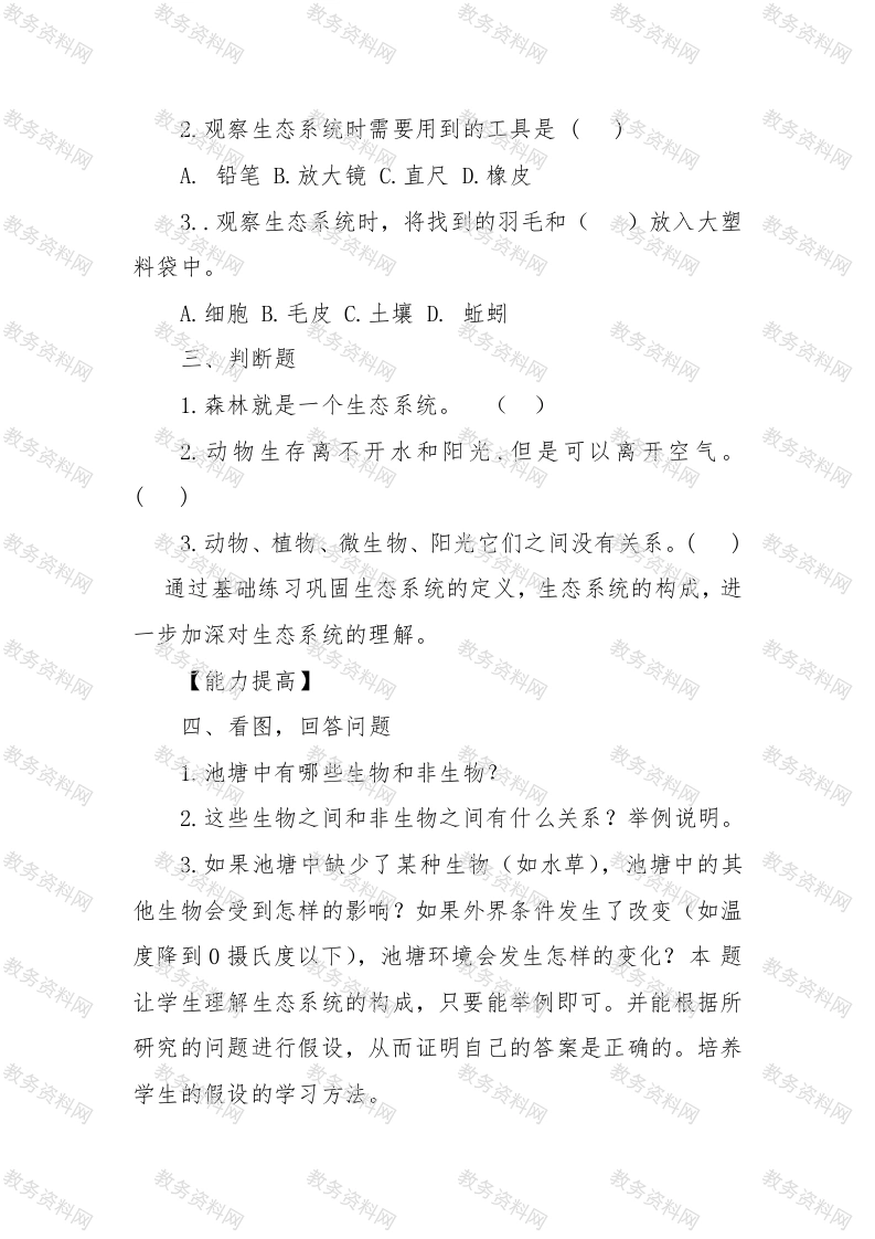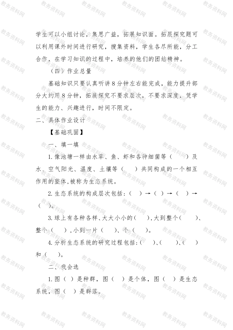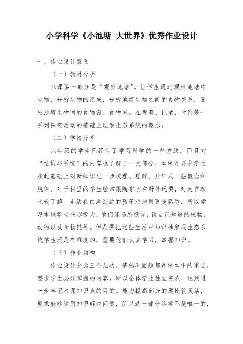 小学科学《小池塘大世界》优秀作业设计一、作业设计意图(一)教材分析本课第一部分是“观察池塘”。让学生通过观察池塘中生物,分析生物的组成,分析池塘生物之间的食物关系,画出池塘生物间的食物链、食物网。在观察、记录、讨论等一系列探究活动的基础上理解生态系统的概念。(二)学情分析六年级的学生已经有了学习科学的一些方法,而且对“结构与系统”的内容也了解了一大部分,本课是要求学生在此基础上对新知识进一步梳理、理解、升华成一些概念和规律。对于村里的学生经常跟随家长在野外玩耍,对大自然比较了解。生活在白洋淀边的孩子对池塘更是熟悉。所以学习本课学生兴趣极大,他们能畅所欲言,谈自己知道的植物,动物以及食物链等。但是要把这些生活中知识抽象成生态系统学生还是有难度的,需要他们认真学习,掌握知识。(三)作业结构作业设计分为三个层次,基础巩固题都是课本中的重点,要求学生必须掌握的内容。所以全体学生独立完成,达到进一步牢记本课知识点的目的。能力提高部分的题比较灵活,要求能够运用知识解决问题,所以这一部分答案不是唯一的,