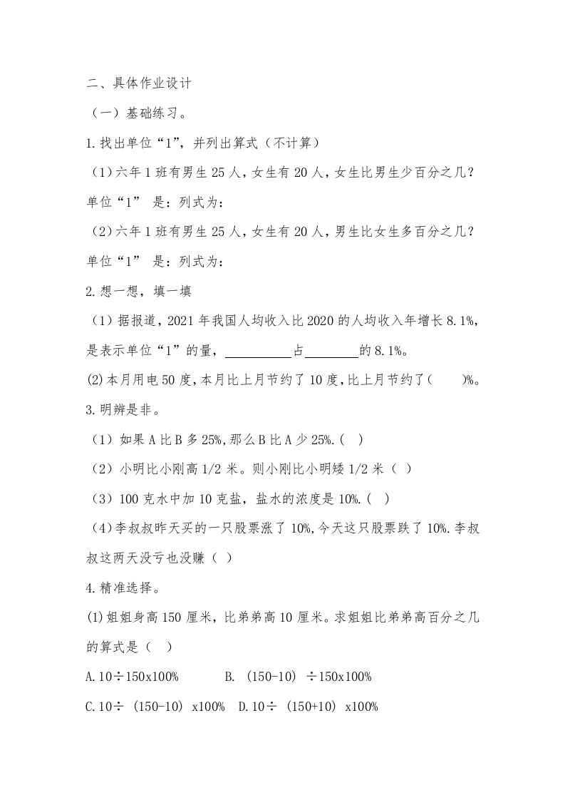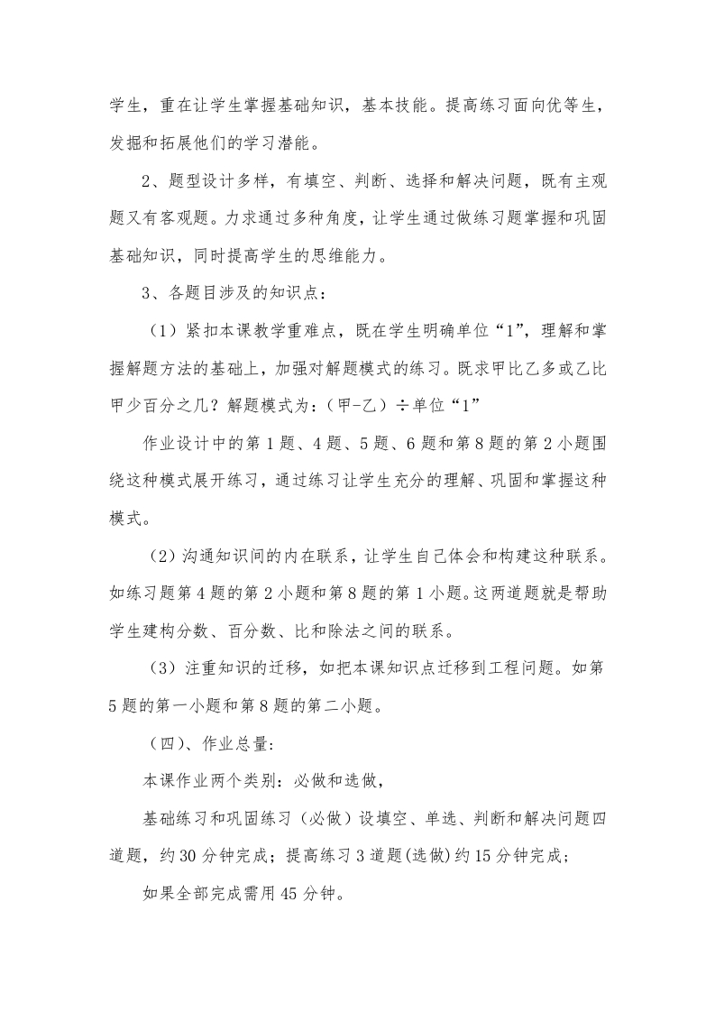 《求一个数比另一个数多(少)百分之几》作业设计一、作业设计意图(一)教材分析这部分内容是在学生已经理解百分数的意义,会求一个数是另一个数的百分之几的基础上教学的。“求一个数比另一个数多(少)百分之几”的实际问题是“求一个数是另一个数的百分之几”的实际问题的发展。通过教学,既深化了学生对百分数意义的理解,体会百分数在实际生活中的应用价值,也有利于促进学生数学思维的发展。让学生感受数学知识的逻辑之美,感悟数学知识的魅力。同时,通过总结求一个数比另一个数多或少百分之几的方法,培养学生观察、分析、抽象概括的能力。(二)学情分析学生对于百分数并不陌生,他们有的可能已经会计算简单的应用,并且掌握一定的计算方法,但大多数学生对求一个数比另一个数多或少百分之几的方法以及计算过程掌握不够好,尤其是对确定单位“1”的量存在困难,找不到比较的标准。因此,在教学中和作业设计中引导学生从基础概念入手:确定单位“1”,确定做比较的两个量。进而引导学生总结和掌握计算方法。(三)作业结构1、形式上分层设计,既面向全体学生,又兼顾一部分优等生。作业分为基础练习、巩固练习和提高练习。基础和巩固练习面向所有