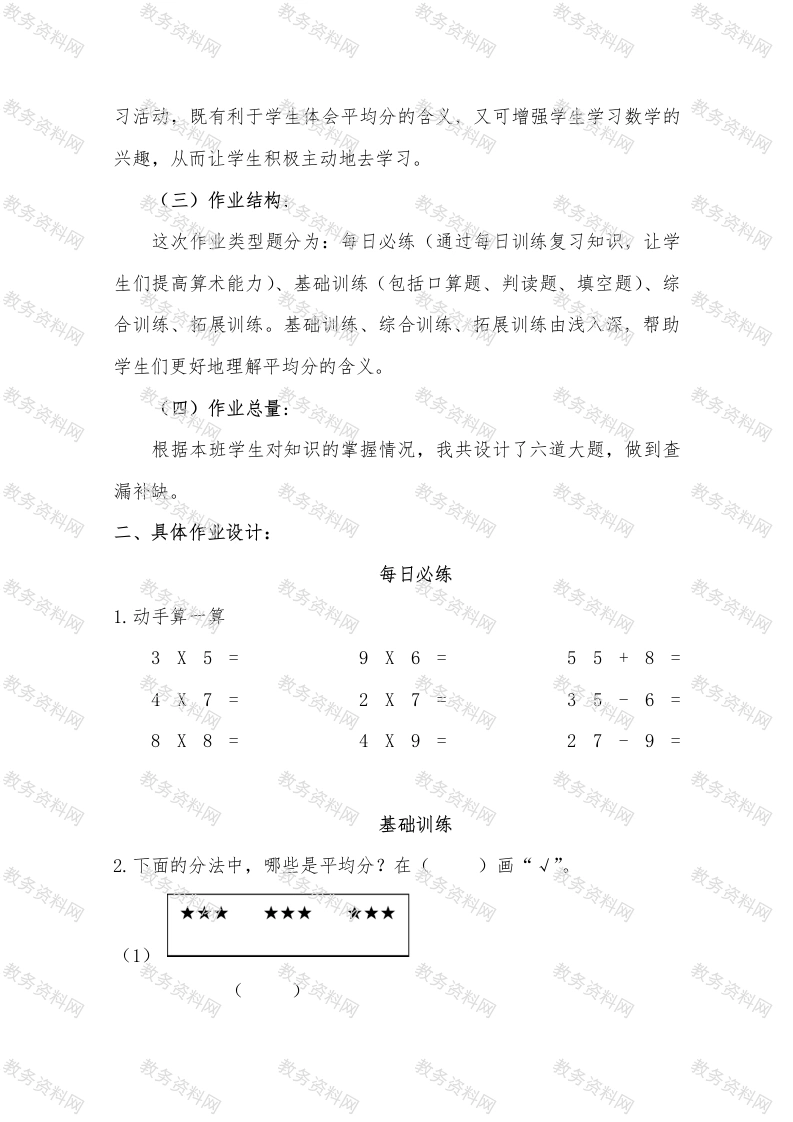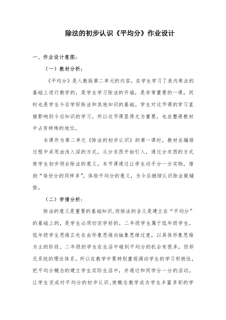 除法的初步认识《平均分》作业设计一、作业设计意图:(一)教材分析;《平均分》是人教版第二单元的内容,在学生学习了表内乘法的基础上进行教学的,是学生学习除法的开端,是非常重要的一课,同时也是学生今后学好除法和其他知识的基础。学生对这节课的学习直接影响到今后知识的学习,所以这节课显得尤为重要,也在整册教材中占有特殊的地位。本课作为第二单元《除法的初步认识》的第一课时,教材在编排过程中采用由浅入深的方式,从分东西开始引入,通过分东西的方式使学生初步领会除法的意义。本节课通过让学生动手分一分实物,借助“每份分的同样多”,体验平均分的意义,为今后继续认识除法做铺垫。(二)学情分析:除法的意义是重要的基础知识,而除法的含义是建立在“平均分”的基础上的,是学生必须切实学好的。二年级学生属于低年级学生,低年级学生思维正处在由形象思维向抽象思维过度,以具体形象思维为主的阶段。二年级的学生在生活中碰到平均分的机会有很多,但却无系统的理论体系,所以在教学中要特别重视调动学生的学习积极性,把平均分概念的建立学生实际生活中,并通过和同学分一分的活动,让学生完成对平均分的初步认识,使概念教学成为学生丰富多彩的学
