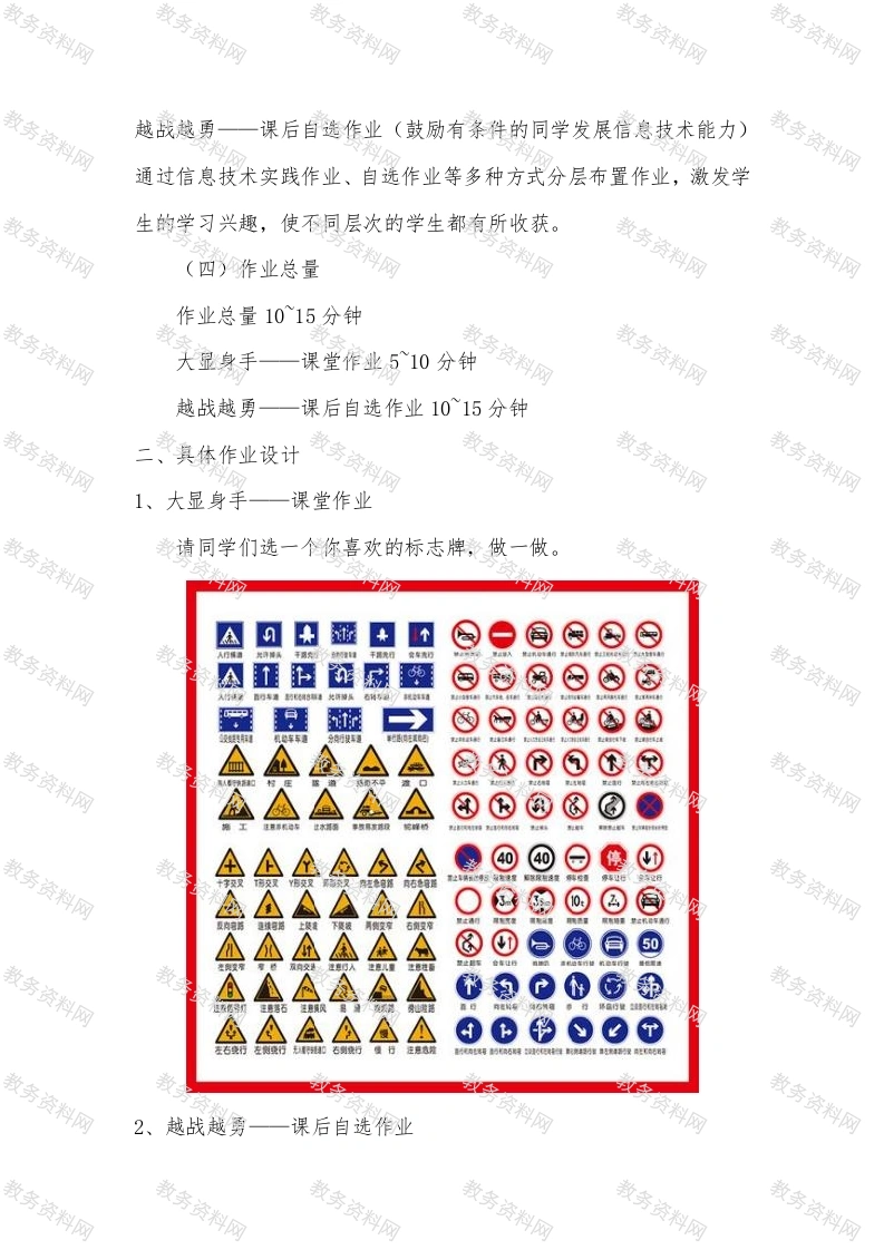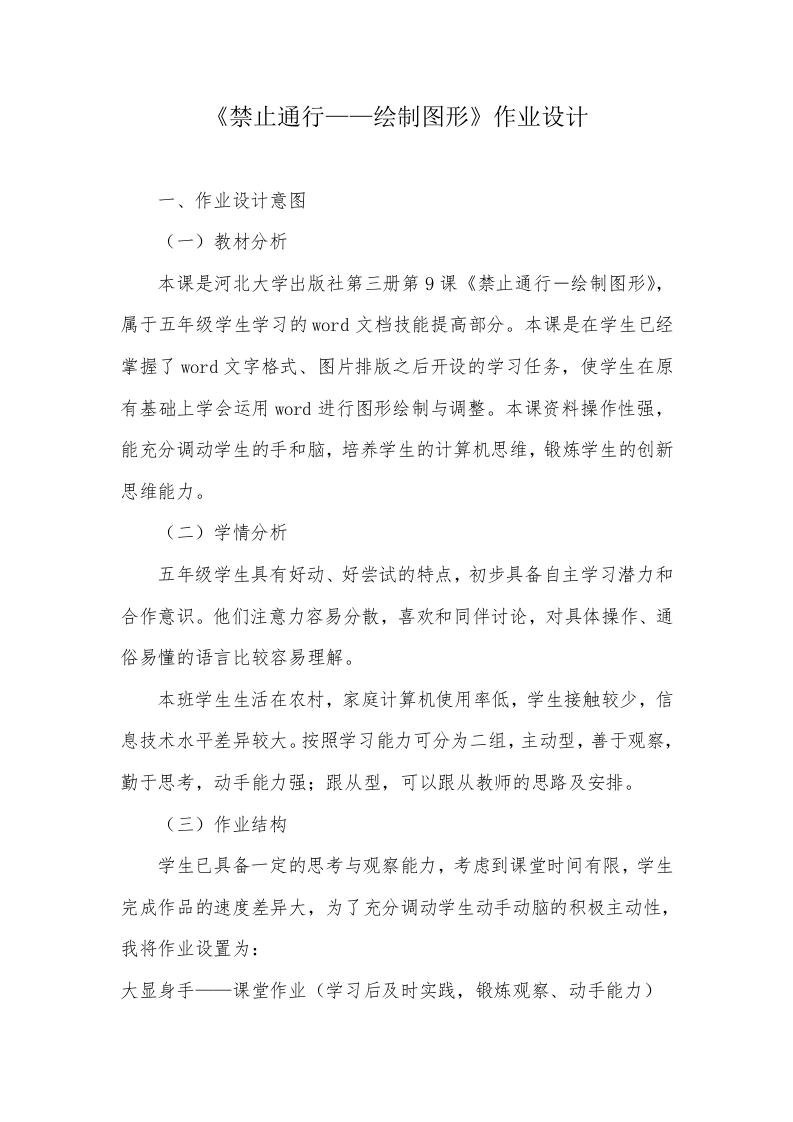 《禁止通行一一绘制图形》作业设计一、作业设计意图(一)教材分析本课是河北大学出版社第三册第9课《禁止通行一绘制图形》,属于五年级学生学习的wod文档技能提高部分。本课是在学生已经掌握了word文字格式、图片排版之后开设的学习任务,使学生在原有基础上学会运用wOrd进行图形绘制与调整。本课资料操作性强,能充分调动学生的手和脑,培养学生的计算机思维,锻炼学生的创新思维能力。(二)学情分析五年级学生具有好动、好尝试的特点,初步具备自主学习潜力和合作意识。他们注意力容易分散,喜欢和同伴讨论,对具体操作、通俗易懂的语言比较容易理解。本班学生生活在农村,家庭计算机使用率低,学生接触较少,信息技术水平差异较大。按照学习能力可分为二组,主动型,善于观察,勤于思考,动手能力强;跟从型,可以跟从教师的思路及安排。(三)作业结构学生已具备一定的思考与观察能力,考虑到课堂时间有限,学生完成作品的速度差异大,为了充分调动学生动手动脑的积极主动性,我将作业设置为:大显身手一课堂作业(学习后及时实践,锻炼观察、动手能力)