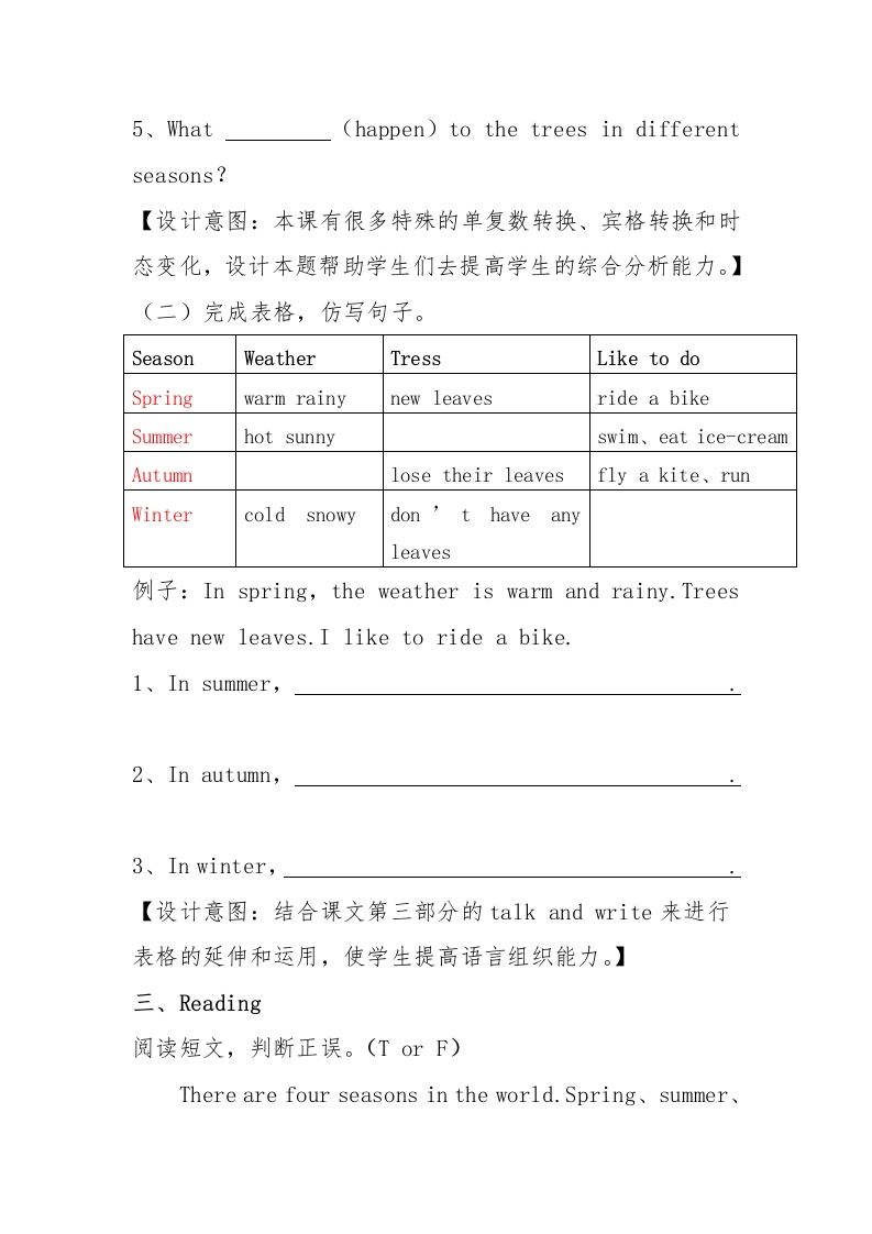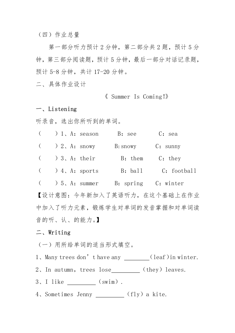 小学英语《Summer Is Coming!》作业设计一、作业设计意图(一)教材分析本课为六年级下册第三单元第一课,在本单元学习内容中,Li Ming、Jenny和Danny将讨论他们的暑假计划,尽情享受夏季的各种活动。本课为本单元的第一课,课题为“Summer Is Coming!”。本课将教授描述自然四季变化和夏季活动的词汇及句型。(二)学情分析在进行本节课学习之前,学生已经掌握了现在进行时、一般过去时、一般现在时等基本英语时态,并且具备了一定的听说读写能力。在五年级下学期学习的季节知识基础上,能够熟练运用英语对四个季节以及每个季节的气候特点进行描述与表达;能够简单描述个人以及家人的喜好。课堂上,他们能够根据教师的指令完成学习任务,并丰富自己已有的知识体系。(三)作业结构本次作业设计共四个板块,Listning、Writing、Reading和Spraking,也就是听、说、读、写。英语是一门语言,一门应用性语言,所在在本次作业设计中,我进行了这四部分的作业划分,在不同能力上进行训练。