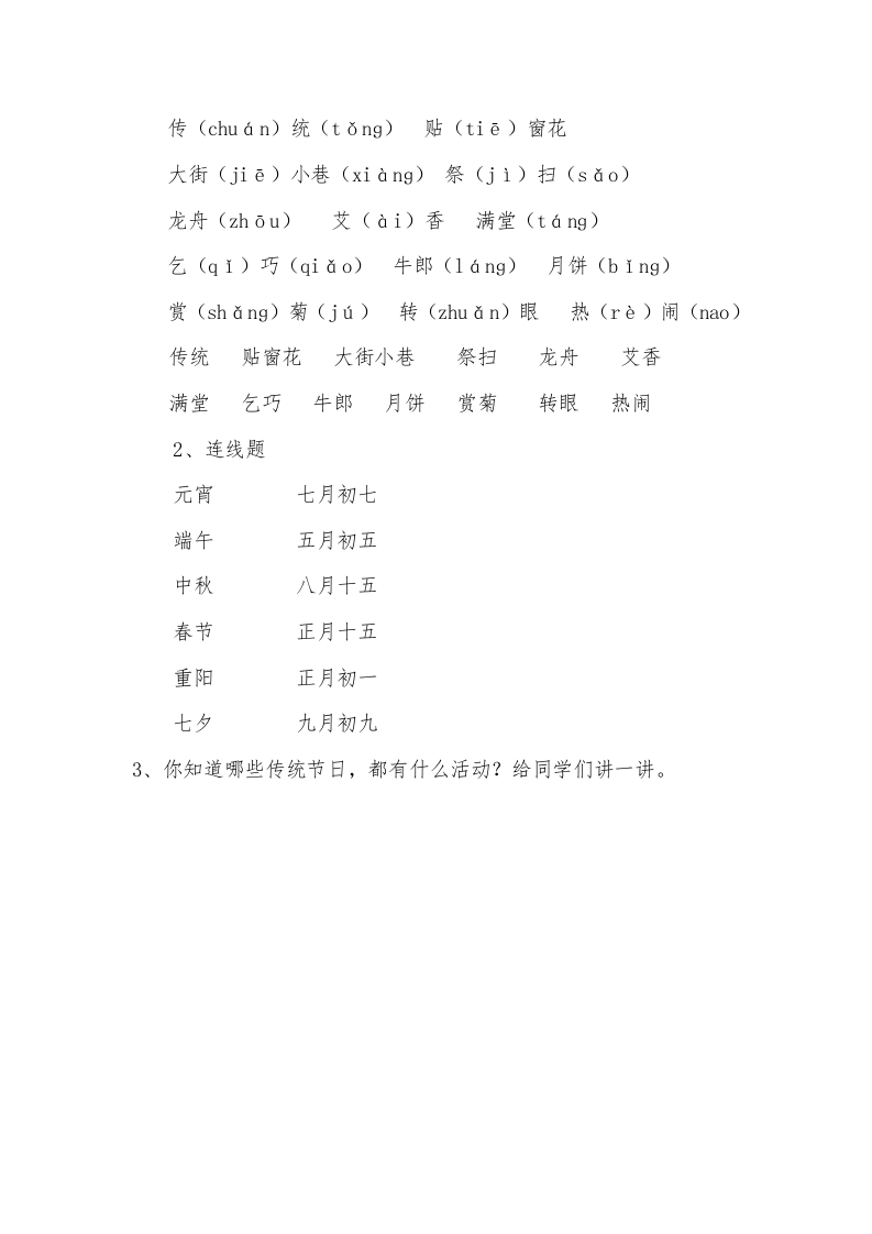 《传统节日》作业设计一、作业设计意图作业是小学语文必不可少的一项内容,作业是用来帮助学生复习巩固所学知识的,过量的作业其效果只能是适得其反。所以我认为教师必须在设计作业上多下功夫。二、教材分析《传统节日》是一首介绍传统节日的童谣,本课的内容贴近生活,浅显易懂。课文以时间为顺序,抓住各传统节日的习俗活动,让学生从中认识、了解传统节日。课文配有两幅色彩鲜明的插图一一春节贴窗花和端午赛龙舟,这样调动起了学生的学习兴趣。三、学情分析因为是二年级的学生,根据学生年纪还小的特点,记忆和理解力较弱,所以我在教学本课时,充分发挥多媒体课件的作用,多姿多彩的图片和视频与课文相结合,这样易于学生理解,而且激发了学生的学习兴趣。四、作业结构:认字连线课外延伸五、作业总量:共三道题大约35分钟完成。六、作业设计1、先认读带有拼音的词语,再遮挡上拼音读下边的词语。