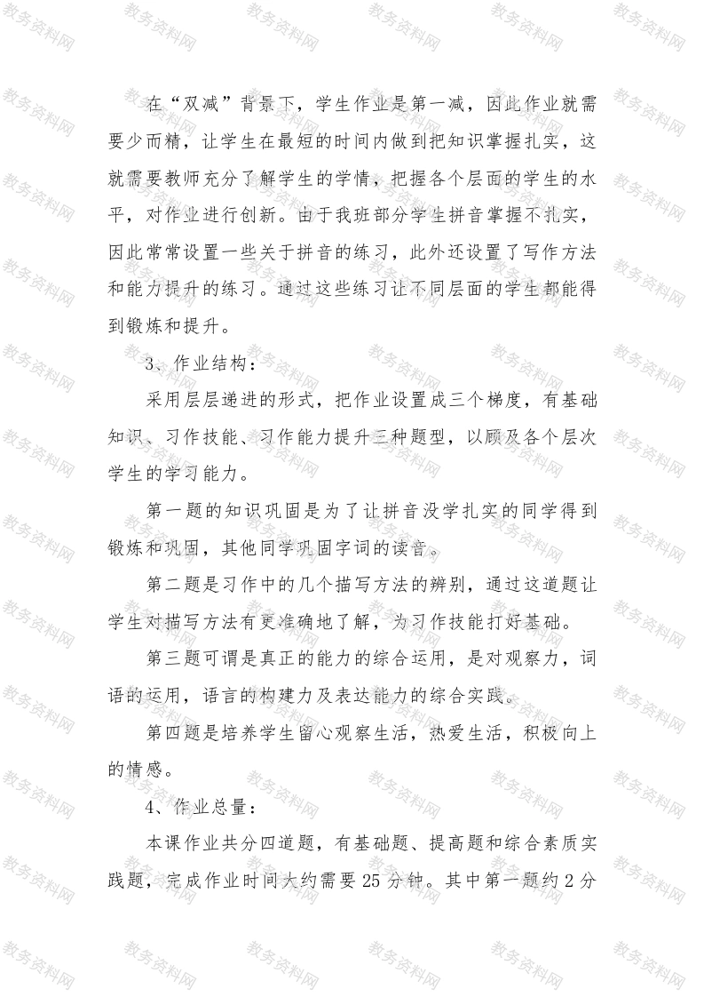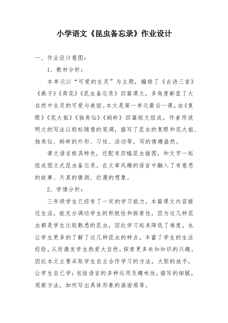 小学语文《昆虫备忘录》作业设计一、作业设计意图:1、教材分析:本单元以“可爱的生灵”为主题,编排了《古诗三首》《燕子》《荷花》《昆虫备忘录》四篇课文,多角度彰显了大自然中生灵的可爱与美丽。本文是第一单元最后一课,由《复眼》《花大姐》《独角仙》《蚂蚱》四篇短文组成,作者用说明文的写法以轻松随意的笔调,描写了昆虫的复眼和花大姐、独角仙、蚂蚱的外形、习性、活动等,写的情趣盎然。课文语言极具特色,还配有四幅昆虫插图,和文字一起组成图文式昆虫备忘录。在文章风趣的语言中融入了有意思的故事、天真的猜测、烂漫的想象。2、学情分析:三年级学生已经有了一定的学习能力,本篇课文内容接近生活,能充分调动学生的积极性和探索性,因为这几种昆虫都是学生比较熟悉的昆虫,因此学习起来降低了难度,也让学生更多的了解了这几种昆虫的特点,丰富了学生的生活经验,从而激发学生热爱大自然,探索更多未知知识的兴趣。因此本文主要采取学生自主合作学习的方法,大胆的放手,让学生自己学:包括语言的多种运用及趣味性,描写的细腻,观察方法,如何写出具体形象的画面感等。