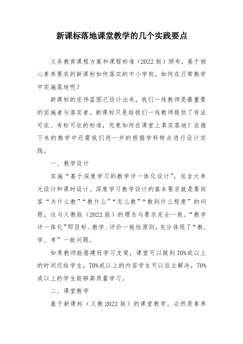 新课标落地课堂教学的几个实践要点义务教育课程方案和课程标准(2022版)颁布。基于核心素养要求的新课标如何落实的中小学校,如何在日常教学中实施落地呢?新课标的宏伟蓝图已设计出来,我们一线教师是最重要的实施者与落实者。新课标只是给我们一线教师提供了有法可依、有标可依的标准,究竟如何在课堂上真实落地?在接下来的教学中还需我们进一步的根据学科特点进行设计实践。一、教学设计实施“基于深度学习的教学评一体化设计”,包含大单元设计和课时设计。深度学习教学设计的基本要求就是要回答“为什么教”“教什么”“怎么教”“教到什么程度”的问题,这与义教版(2022版)的理念与要求完全一致。“教学评一体化”即目标、教学、评价一致性原则,充分体现了“教、学、考”一致问题。如果教师能搭建好学习支架,课堂可以做到70%或以上的时间还给学生,70%或以上的内容学生可以自主解决,70%或以上的学生能够高质量学习。二、课堂教学基于新课标(义教2022版)的课堂教学,必然是素养