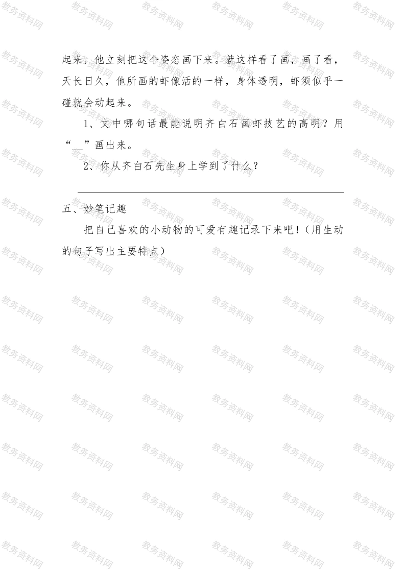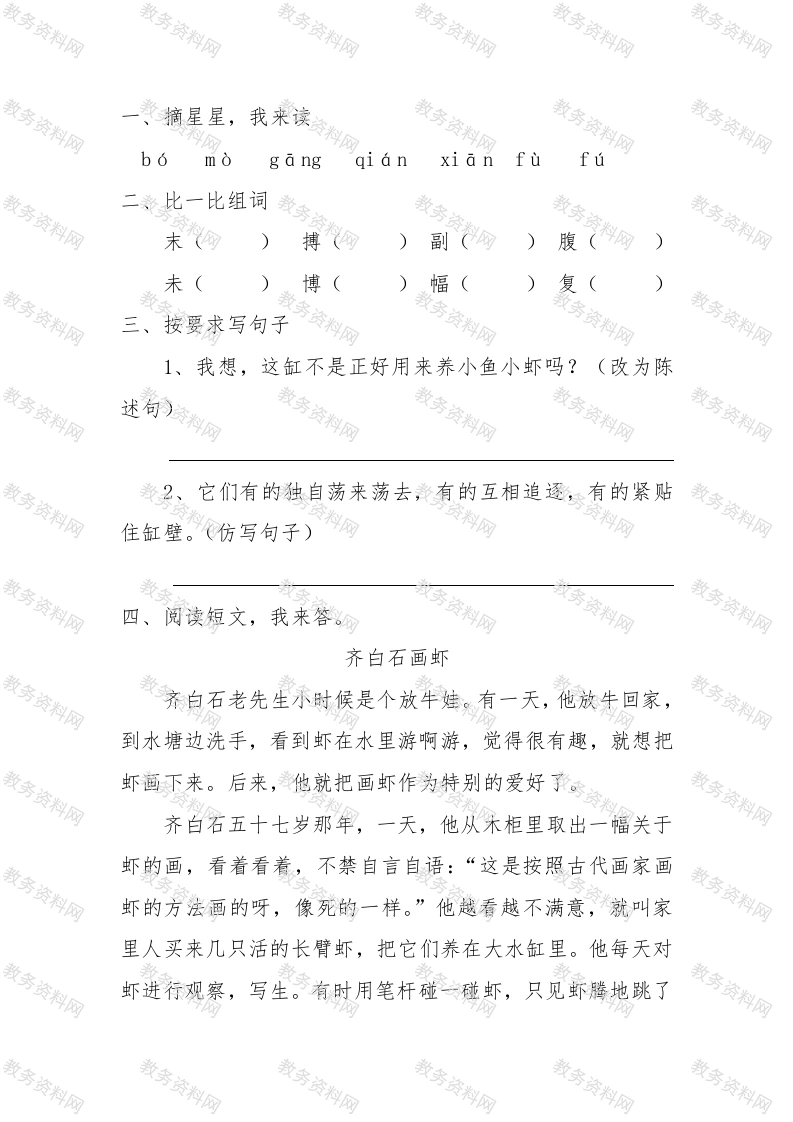 《小虾》作业设计教材分析:《小虾》这篇课文通过对小虾外形、特点等的描写,抒发了作者对小虾的喜爱之情。通过学习课文,让学生在读中理解词语、积累词语,体会小虾的特点,感悟作者的喜爱之情。学情分析:三年级学生的语文识字仍然是重要内容,虽然不再作为教学重点,但三年级是错别字的高发期。学生理解词语和句子的能力需要作为重点。三年级学生需增大阅读量,拓宽阅读面。我班的学生有四分之一的优等生,他们字词基础较好。语句运用能力可以,阅读能力比较薄弱,还有待进一步加强练习。四分之一后进生的学生拼音掌握不牢,字词基础差,形近字组词易错。中等生也需加强句子练习。所以我打算分层设计作业。作业结构:1、基础积累巩固(后进生做此题)2、阅读能力提升(中等生做此题)3、思维创新拓展(优等生做次题)作业总量:每生不超过30分钟作业设计: