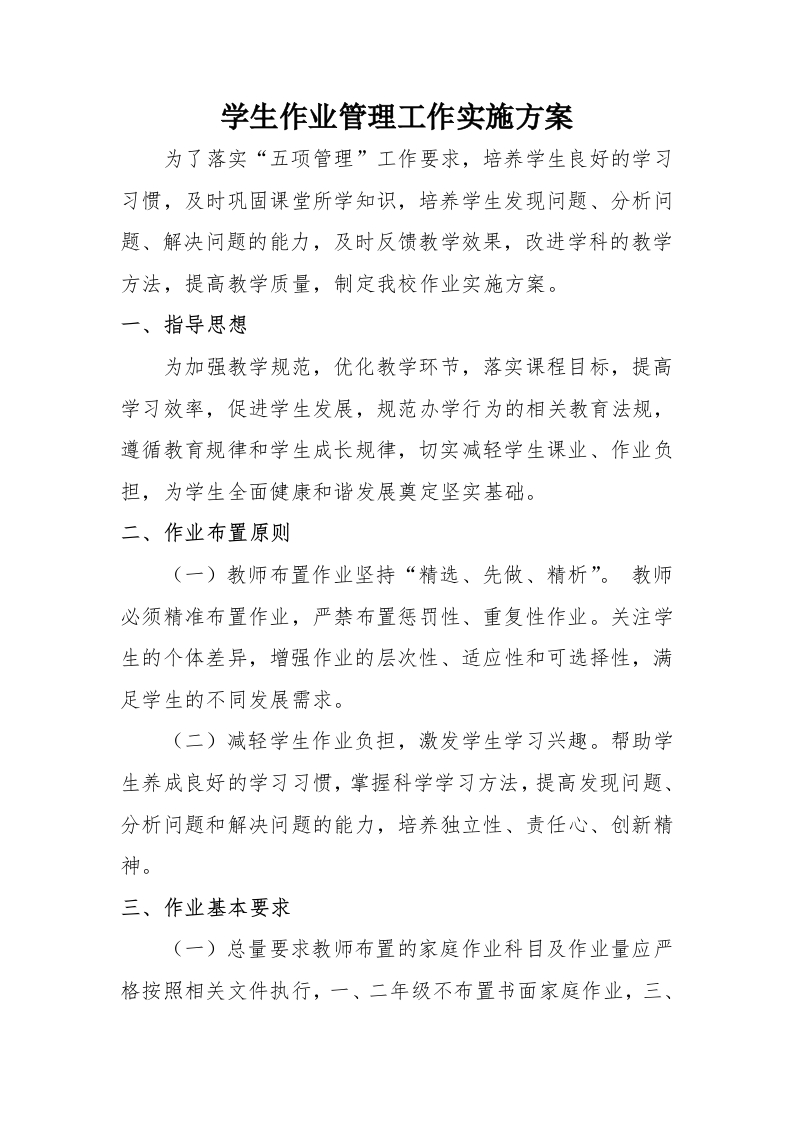 学生作业管理工作实施方案为了落实“五项管理”工作要求,培养学生良好的学习习惯,及时巩固课堂所学知识,培养学生发现问题、分析问题、解决问题的能力,及时反馈教学效果,改进学科的教学方法,提高教学质量,制定我校作业实施方案。一、指导思想为加强教学规范,优化教学环节,落实课程目标,提高学习效率,促进学生发展,规范办学行为的相关教育法规,遵循教育规律和学生成长规律,切实减轻学生课业、作业负担,为学生全面健康和谐发展奠定坚实基础。二、作业布置原则(一)教师布置作业坚持“精选、先做、精析”。教师必须精准布置作业,严禁布置惩罚性、重复性作业。关注学生的个体差异,增强作业的层次性、适应性和可选择性,满足学生的不同发展需求。(二)减轻学生作业负担,激发学生学习兴趣。帮助学生养成良好的学习习惯,掌握科学学习方法,提高发现问题、分析问题和解决问题的能力,培养独立性、责任心、创新精神。三、作业基本要求(一)总量要求教师布置的家庭作业科目及作业量应严格按照相关文件执行,一、二年级不布置书面家庭作业,三、
