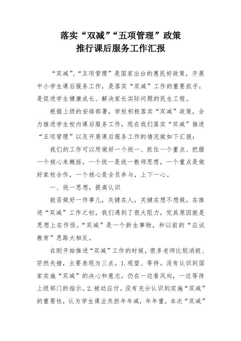 落实“双减”“五项管理”政策推行课后服务工作汇报“双减”、“五项管理”是国家出台的惠民好政策,开展中小学生课后服务工作,是落实“双减”工作的重要抓手,是促进学生健康成长、解决家长实际问题的民生工程。根据上级的安排部署,学校积极落实“双减”政策,全力推进学生校内课后服务工作,现在我们落实“双减”推进“五项管理”以及开展课后服务工作的情况做如下汇报:我们的工作可以用做好一个统一、抓住一个重点、把握一个核心来概括。一个统一是统一教师思想,一个重点是做好家校合作,一个核心是全员参与,上下一心。一、统一思想,提高认识能否做好一件事儿,关键在人,关键在想不想做。在推进“双减”工作之初,我们遇到了很大阻力,究其原因就是思想上在作怪。“双减”是一个新生事物,和以前的“应试教育”思路大相反。在刚开始推进“双减”工作的时候,很多老师比较消极、茫然失措,主要表现为三点。1.观望、等待。没有认识到国家实施“双减”的决心和意志,仍在一边看风向,一边等待上级部门的指示。2.被动应付。没有充分认识到实施“双减”的重要性,认为学生课业负担年年减,年年重,本次“双减”