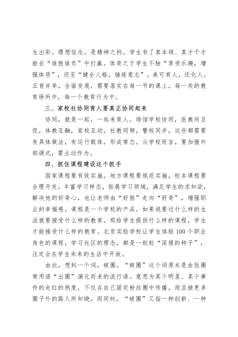 202X全国中小学书记校长能力培训班学习心得体会这不仅是一次学习的机会,更是一次与全国同仁交流、碰撞思想的盛会X月X日至X月X日,中央党校和教育部联合举办了全国中小学党组织书记校长培训班。全国25万余名中小学党组织书记校长参加培训,当我得知有机会参加这次全国性的校长书记培训班时,内心充满了激动与期待。这不仅是一次学习的机会,更是一次与全国同仁交流、碰撞思想的盛会。我怀揣着对教育的热情与梦想,踏上了前往培训班的征途。几天来的听讲,收获很多。一、一种使命感油然而生教育强国是一号工程,书记校长作为最后一公里的执行者,要走在教师的前列。面对智能时代的到来,教育的数字化意味着教育的发展已开辟了新赛道。能不能跟上,能不能“入道”,能不能弯道超车,都在考验着能力和水平。本领恐慌,从来没有今天这么迫切。今后的教学空间环境至少是“教师+机器+学生”,而教师如果不想沦落为“机器的电池”,就要学习、突破、转变,从而创新育人方式,由此教育也会在管理体制、办学模式、保障力量、教育评价等诸多方面发生质的改变。二、五育并举,要实实在在地去做教育是党之大计,国之大计。我们培养的是建设者,是接班人。立德树人,着眼的是人的全面发展,要让每个学生的人