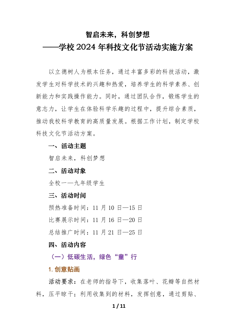 智启未来,科创梦想一学校2024年科技文化节活动实施方案以立德树人为根本任务,通过丰富多彩的科技活动,激发学生对科学技术的兴趣和热爱,培养学生的科学素养、创新能力和实践操作能力。同时,通过团队合作,锻炼学生的意志力,让学生在体验科学乐趣的过程中,提升综合素质,推动我校科学教育的高质量发展。根据工作计划,制定学校科技文化节活动方案。一、活动主题智启未来,科创梦想二、活动对象全校一一九年级学生三、活动时间预热准备时间:11月10日一15日比赛展示时间:11月16日一20日总结推广时间:11月21日一25日四、活动内容(一)低碳生活,绿色“童”行1.创意贴画活动要求:在老师的指导下,收集落叶、花瓣等自然材料,压平晾干;利用收集到的材料,发挥创意,通过剪贴、1/11