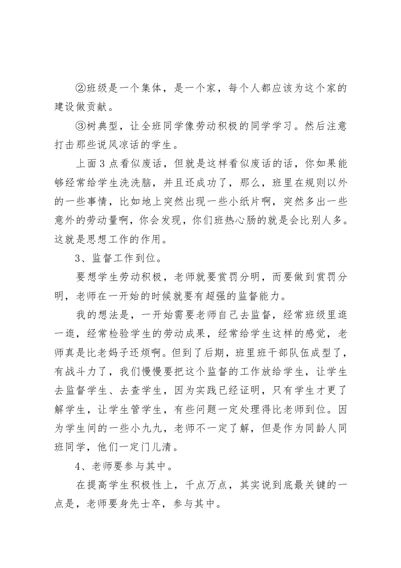 班级卫生扣分,在班主任会议上,副校长就如何提高学生劳动积极性讲了4点想法各位班主任:大家辛苦了!最近部分班级卫生不容乐观,扣分较多,说到底是班主任的工作落实还不到位,其实就是方法上的问题,解决这类问题虽然没有非常固定的方法,但要让学生劳动积极,班主任老师可以遵循以下几点原则,逐一对应落实,学生劳动的积极性就会很高,减少被扣分。1、分工明确,责任到人。学生有的时候不爱劳动,不是他真的不爱劳动,而是他对分工不满意,心里不平衡,或者大家都在“吃大锅饭”,责任没有到某个学生,那么,你自然是差遣不动他的。所以,要想学生劳动积极,先把分工做明确,在有些学生爱计较的班里,你甚至每一块瓷砖都要给他分清楚。做得极端的,我甚至见过给地上划线,写上包干同学的名字。只要班里每一块地都有“地主”了,这块地干不干净和他的脸面挂钩了,然后再配合上一些奖励措施,那学生活干起来,想要不积极也难。有些学生甚至能做到一下课就守着那块地。2、思想工作到位。在劳动这一点上,我们老师要教育学生这么几点①劳动不等于干苦力。劳动者光荣。