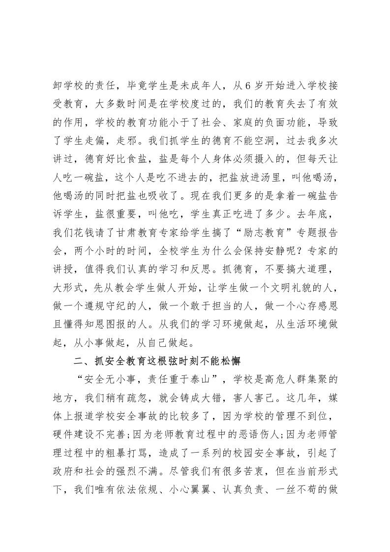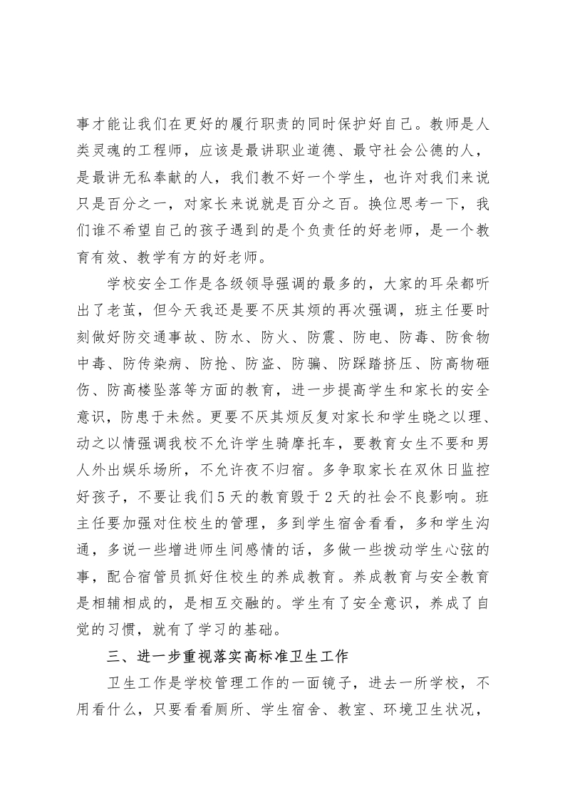 班主任工作会议上,校长讲话希望各班主任在今后的工作中创新思想、结合实际、围绕目标、开展工作各位班主任:今天下午,学校德育处组织召开班主任会议,我想其目的还是要大家统一思想、提高认识、明确责任、强化措施,进一步推进学校教育教学工作,优化班级管理,创新德育思维,构建新型教学模式,促进学生文化知识学习和思想品德修养的统一、理论学习和社会实践的统一、全面发展和个性发展的统一,切实抓好班级管理,以人为本,培养符合时代发展要求的学生,做一个智慧型的班主任,做一个班级管理的艺术家。刚才几个领导都做了很好的要求,下面我再强调四点意见,有些建议和意见可能和刚才几个领导的要求有所重复,但我还是希望,大家真正领会领导讲话精神,扎实贯彻落实好各项要求。一、真正把“德育先行”落到实处在新的历史时期,中小学德育工作面临新情况新挑战,大家都有感受,现在的学生不好教,10后学生品行与我们的认识有很大的出入,我们也感到很困惑,对于现在的学生,我们不用看多少,看看他们有无爱心,是否勤奋,有无道德,就可管中窥豹。现在的学生连学校都不爱,何谈爱国,连基本的礼义廉耻都不懂,何谈荣辱观。当今学生发展成现在令人堪忧的状态,责任在谁呢?固然有家庭责任、社会责任,但我们不能推
