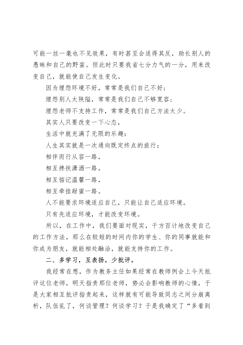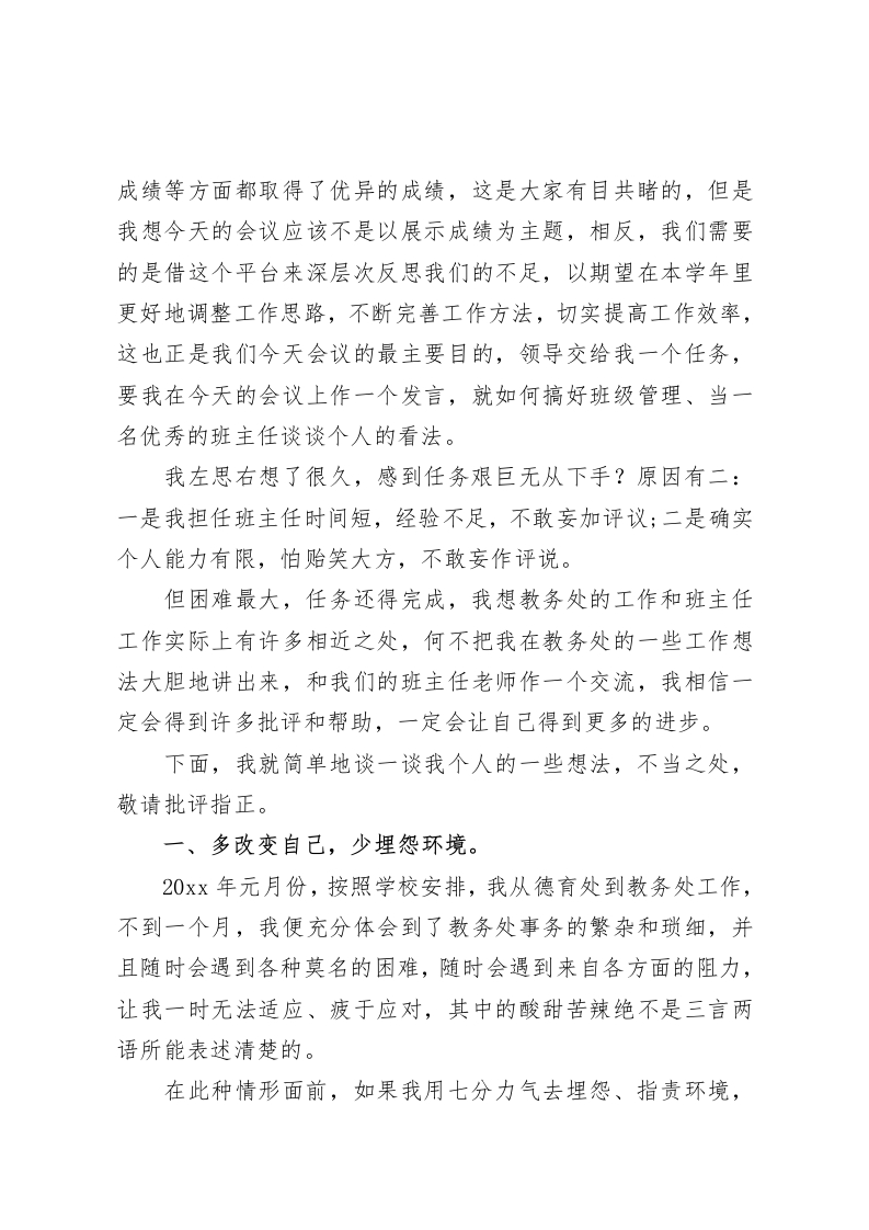 班主任会议,副校长兼教务主任讲话要是凡事都能和学生多多商量,听听学生的意见,一定更容易成功班主任老师们:大家下午好!新学年已经开始了,各项工作也渐渐步入正轨,在校长室的统一安排下,经过德育处的紧张筹备,新学年的第X次班主任会今天隆重召开了,这一切都充分说明了学校领导班子对班主任工作的高度重视。我们完全有理由相信,有了学校领导的高度重视,我们的班级管理工作在新的学年一定会再上新的台阶。班主任工作在学校工作中占据着特殊地位,在教书育人工作中起着特殊作用。一个学校优良的校风、学风、教学质量,大都取决于班主任工作的勤奋、务实、到位。过去的一学年,全体班主任本着对学生负责、对事业负责、对社会负责的态度,忠于职守、兢兢业业、呕心沥血、无私奉献,把学生当子女,视学生为弟妹,学习上淳淳教诲,循循善诱;生活上关怀备至,体贴入微;行为上言传身教,以身示范;受到了家长、社会和上级领导的广泛好评和普遍赞誉,也取得巨大的成绩。在此,我代表教务处向战斗在教学一线、为学校发展作出巨大贡献的全体班主任老师表示衷心的感谢。过去的一学年,我们无论是班级管理、班级活动还是教学