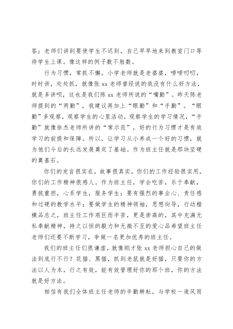 班主任论坛闭幕式,校长讲话相信有我们全体班主任老师的辛勤耕耘,与学校一道风雨同舟、同甘共苦各位老师,下午好:本周我们在这里举办第X届班主任工作论坛,其目的就是为了给各位班主任搭建一个相互交流,相互学习的平台,扬长避短,共同进步,共同提高班主任的业务素质和班级管理水平。班主任团队是学校的教师队伍中的一支重要力量,从某种意义上说,班主任的整体素质、班主任的师德面貌、班主任的管理水平、教学水平就代表一个学校的整体水平,所以加强班主任队伍建设是学校工作中的重中之重。我们学校的班主任老师平时工作很踏实,也很务实,大家为了学校整体工作识大体,顾大局,表现出不凡的思想境界。在此,我向全体班主任无私的付出表示衷心的感谢!你们辛苦了!在这次论坛会上,各位班主任都毫不保留的介绍了自己的工作经验,听了这些班主任的精彩发言,我深有感触,总的来说班主任工作就是德育教育、养成教育、有效教学、班级管理制度化,并做好学生和任课教师的桥梁。老师们提到要以身作则,率先垂范,这让我们看到了希望,看到了学校今后发展的动力。当老师看见班里的帕子上的水滴滴答答的,就用盆打来水教学生如何让帕子上的水不再滴滴答