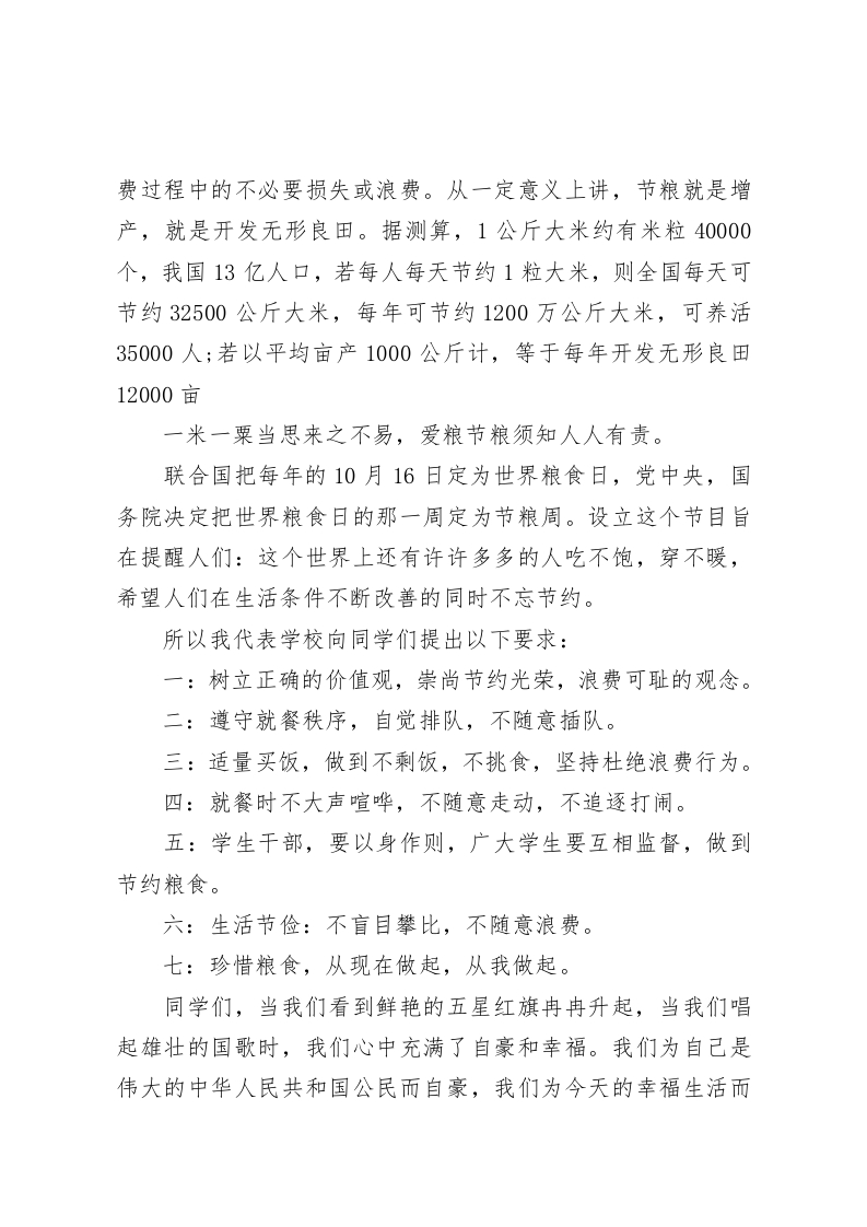世界粮食日,校长国旗下讲话一米一粟当思来之不易,爱粮节粮须知人人有责大家早上好!同学,你扔掉了什么?从小我们就知道那首《悯农》,知道粒粒皆辛苦,节约粮食,反对浪费也是从小就被父母和老师挂在嘴边的。然而,纵观校园浪费的种种情况,往往还是先要从食堂说起。我校的食堂已经对同学们正式开放,今后我们有更好的就餐环境了。在就餐时间内我们不仅要注意买饭的秩序,餐盘的放置,最主要的是要节约粮食。从前,泔水缸中总是堆满了剩饭剩菜,其中不乏雪白的米饭和几乎没动过的蔬菜。平均每三位学生就有一位倒掉小半碗饭菜,有的吃几口就倒掉,饭菜吃不净的情形几乎人人存在。浪费的风气日益兴盛,而人们熟视无睹,无视现实!同学们,当你们倒掉剩下的饭菜时,可曾想过,世界上还有8.5亿多人遭受饥饿,还有很多你们的同龄人因为贫困而不能接受教育。应该说,单个学生的浪费是有限的,而学生群体的浪费是惊人的。我们不能不郑重地呼吁:尊重劳动,杜绝浪费。我国是一个人口众多的农业大国,目前全国人均粮食占有量仅达到温饱水平,粮食问题仍然是国民经济发展中的突出问题。解决我国的粮食问题,一靠增产,二靠节粮。节粮是指在保证基本粮食消费的前提下,尽量减少在粮食加工,流通,消