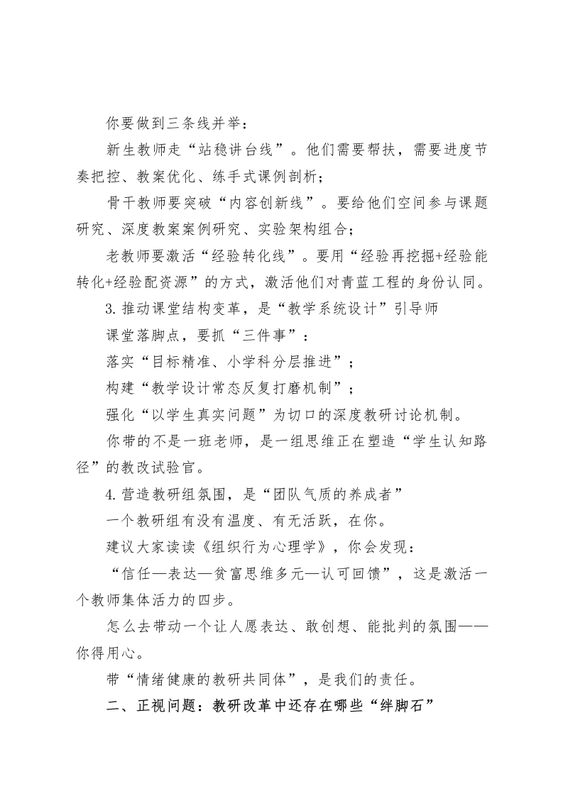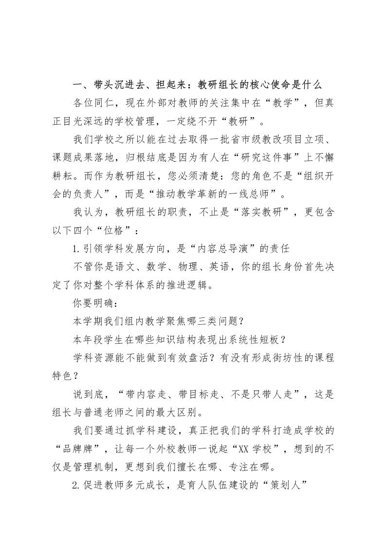 校长在教研组长会议上的讲话:聚焦提质增效,教研组长要干好这3件关键事!尊敬的各位教研组长、各位老师:大家下午好!今天我们召开这场教研组工作会议,不是例行发通知,也不是资料对表签字,而是在新学期已经起步、各项教学任务逐步铺开的关键节点,为我们共同站在“教研推进”“课堂革新”“质量提质”的起跑线上一一做一次思想再统一、任务再明确的集体谈话。前面这句话,不是套话,是实话。对于习惯在一线工作的老师来说,教研从来不是“软性环节”;而对于全校教学发展体系来说,教研组长的思维边界,就决定了我们这所学校科学课堂的边界;教研组长的行动力度,就决定了我们提升教育质量的速度。今天,我不想讲“高层文件怎么说”,我要讲的是:你作为教研组长,必须做什么?你做得够不够实?组内的老师是不是因为你“更清晰了、更活跃了、更有力量了”?在这样的定位下,我把今天的讲话分成三块:第一,明确教研组长的角色使命;第二,剖析当前存在的“老问题”与新问题;第三,共建五项目标清晰、责任清晰、实施清晰的教研组长任务清单。