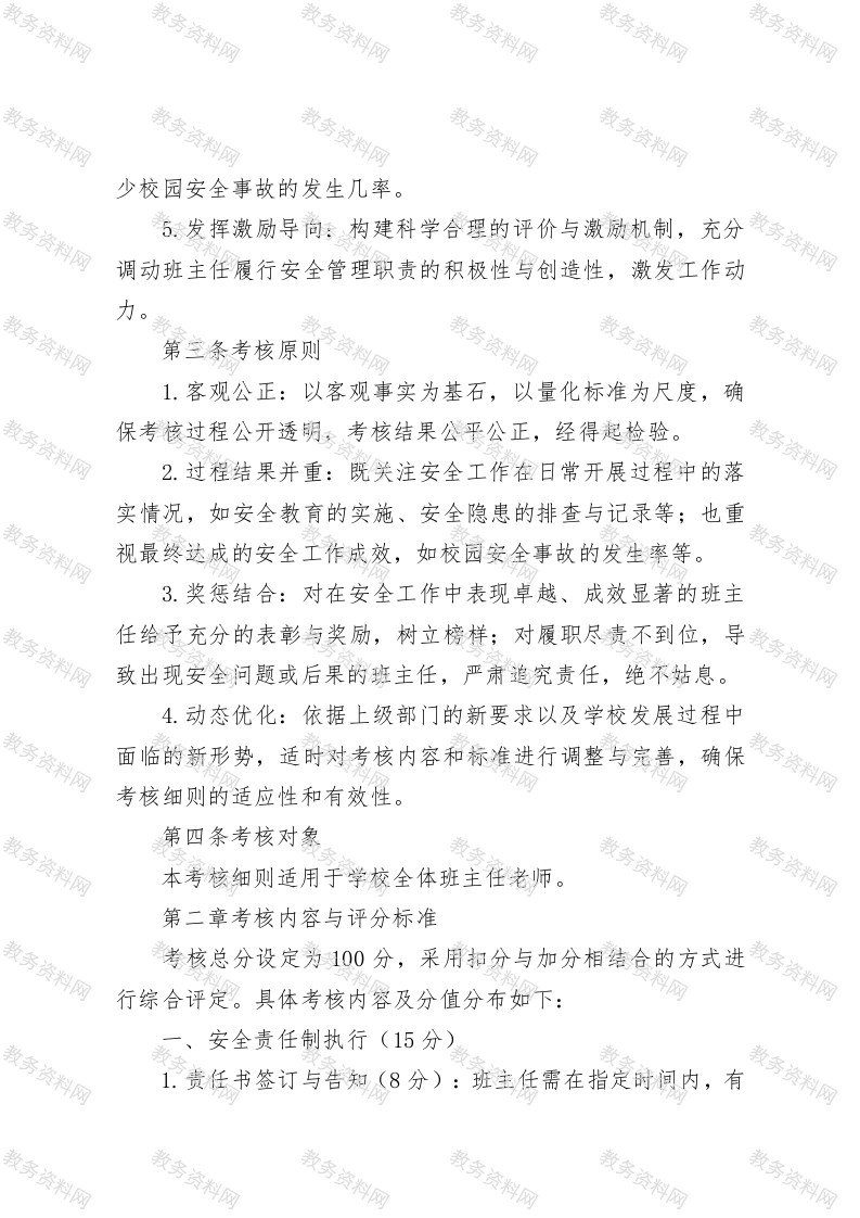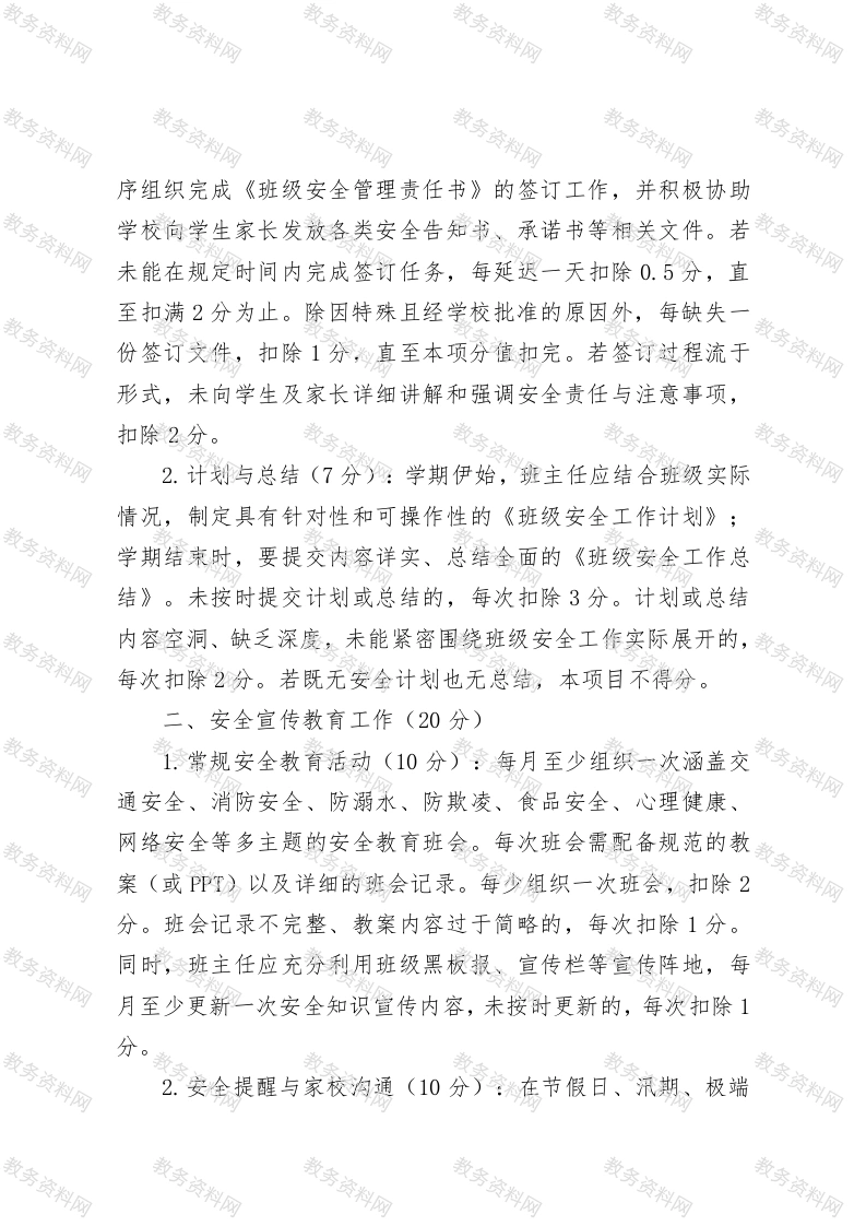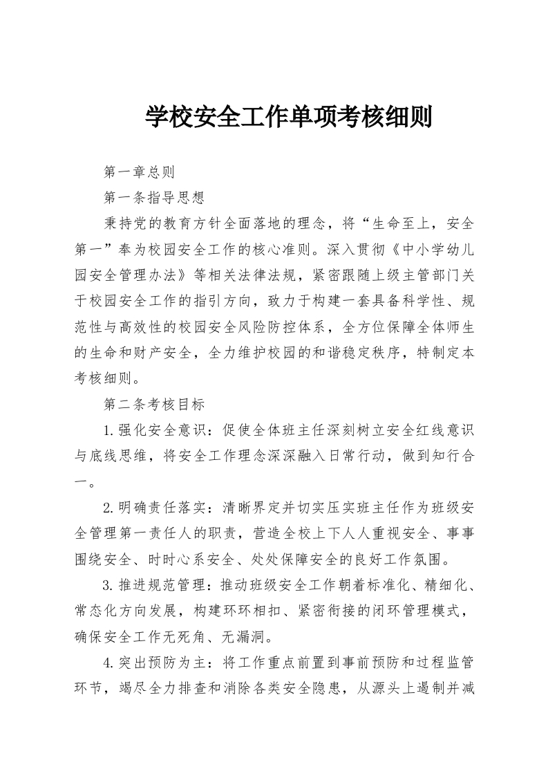 学校安全工作单项考核细则第一章总则第一条指导思想秉持党的教育方针全面落地的理念,将“生命至上,安全第一”奉为校园安全工作的核心准则。深入贯彻《中小学幼儿园安全管理办法》等相关法律法规,紧密跟随上级主管部门关于校园安全工作的指引方向,致力于构建一套具备科学性、规范性与高效性的校园安全风险防控体系,全方位保障全体师生的生命和财产安全,全力维护校园的和谐稳定秩序,特制定本考核细则。第二条考核目标1.强化安全意识:促使全体班主任深刻树立安全红线意识与底线思维,将安全工作理念深深融入日常行动,做到知行合2.明确责任落实:清晰界定并切实压实班主任作为班级安全管理第一责任人的职责,营造全校上下人人重视安全、事事围绕安全、时时心系安全、处处保障安全的良好工作氛围。3.推进规范管理:推动班级安全工作朝着标准化、精细化、常态化方向发展,构建环环相扣、紧密衔接的闭环管理模式,确保安全工作无死角、无漏洞。4.突出预防为主:将工作重点前置到事前预防和过程监管环节,竭尽全力排查和消除各类安全隐患,从源头上遏制并减