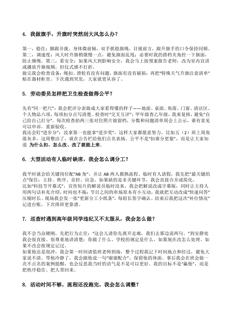 大队委竞选面试题库及答案一小岗位托举大梦想红领巾伴我共成长1.如果我当上大队长,怎么带着团队高效做事?我觉得大队长首先要把事说清楚、把人分明白、把结果看得见”。开学我会先把学期目标写在“任务墙”上,比如活动参与率、卫生达标率、迟到率等,再把每个月的大事拆成一周一周的小任务。每个任务都要有负责人和“B角”,谁临时有事,另一位能顶上。每周一例会、周五小复盘:看看本周哪些做到了,哪些卡住了:卡住就换办法,比如调整动线、增加志愿者,或者把两个环节合并,先保证核心目标不丢。举个例子:如果办“环保嘉年华”,我会把团队分成“秩序组、宣传组、互动组、物资组、摄影组”。每组有清单:时间、地点、需要的东西、成功标准。现场我会拿着“小本本”跟着流程走,一有变化就用对讲/纸条通知各组。活动结束当天就把照片、视频和数据(到场人数、参与次数)收上来,晚上发一张“成果海报”,第二天开5分钟复盘会,总结三个做对的点、两个要改的点,模板留档,下次用起来更快。2.和中队长意见不一样,我会怎么处理?我会先听他把理由讲完,然后用自己的话复述一遍,确认我真的听明白了;再说我的想法和担心的地方。要是还拿不定,我就提议“试一试”:把场地分两边,A方案和B方案各跑一遍,看秩序、用时、安全哪个更好,用事实说话。比如运动会入场,如果他想从东门进、我想从西门进,我们就各带一队试走一遍,计时、观察拥堵点,再决定。涉及全校统一规定的我一定听学校的,涉及班级小风格的就允许有“个性做法”,但不能影响整体秩序。最后把决定和原因写在工作群里,让大家都知道,不“翻旧账”。事后我会当面感谢对方的好建议,让大家感觉是“为事情赢”,不是“为自己赢”。3.我心里觉得宜传委员的核心任务是什么?一句话:让活动“被知道、想参加、玩得好、留得住”。所以我会做四步:前期:提前一周出一张“好看又好懂”的预告海报(时间、地点、亮点),广播站播一段口播,班级群发一个报名小贴士。中期:活动开始就安排“校园小记者”,拍照片短视频、做两条“30秒小采访”,用同学听得懂的语言。后期:当天24小时内发“图文战报”,把数据、笑脸和小故事放上去,让没来的人也想来。素材库:建一个“活动素材文件夹”,名字统一,方便下次班会或评优用。比如“书香打卡月”,我会推出“课间1分钟朗读接力"短视频,每天更新排行榜,班级橱窗放“读书金句”,这样大家会越看越想参加。