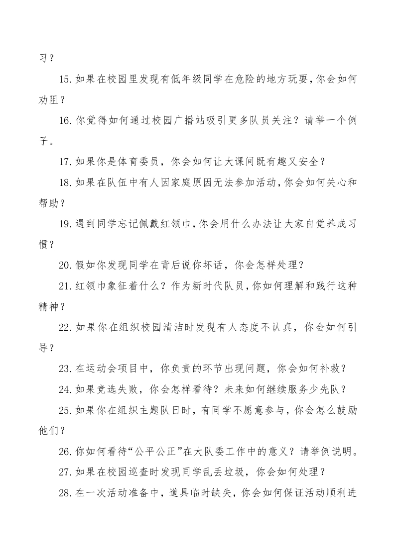 2025年大队委竞选面试题库一小岗位托举大梦想红领巾伴我共成长1.如果你成为大队长,你会如何带领整个大队委团队高效开展工作?2.当你与中队长在工作中意见不同,你会如何处理?3.你认为宣传委员在学校少先队活动中的核心任务是什么?4.如果你担任旗手,遇到升旗时突遇大风,你会怎样保证仪式顺利完成?5.劳动委员怎样才能让卫生检查做到公平公正?请结合实际谈谈。6.如果在一次大型活动中有同学临时缺席,你会如何调整分工?7.如果你在巡查时发现高年级同学违反纪律,但态度不服从,你会怎么做?8.假如你组织的活动时间不够,流程还未完成,你会如何调整?9.如果你的家长担心大队委工作影响学习,你会怎么说服他们支持你?10.在一次升旗仪式中,你突然忘记稿子内容,你会怎样应对?11.作为大队委,如果有同学不喜欢你并质疑你,你会如何化解矛盾?12.如果在一次环保活动中发现有同学偷懒,你会如何带动大家积极参与?13.你认为大队委最重要的品质是什么?请结合实际谈谈。14.在一次红领巾知识测试中,如果成绩不理想,你会如何改进学