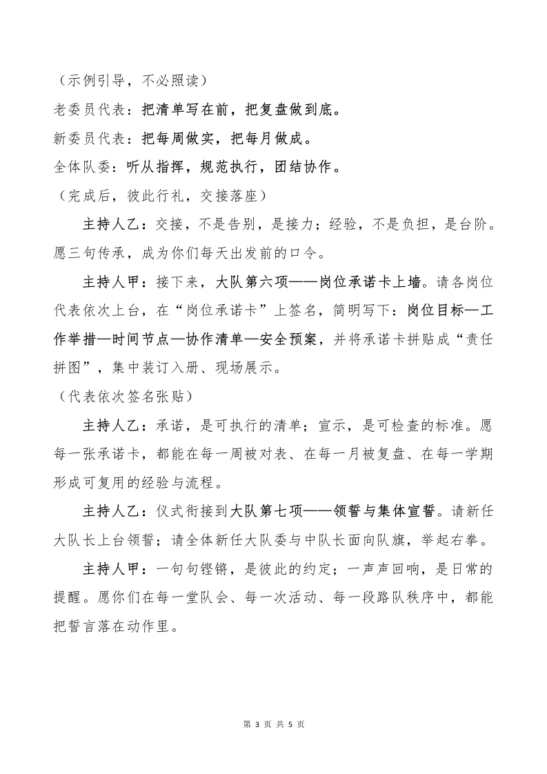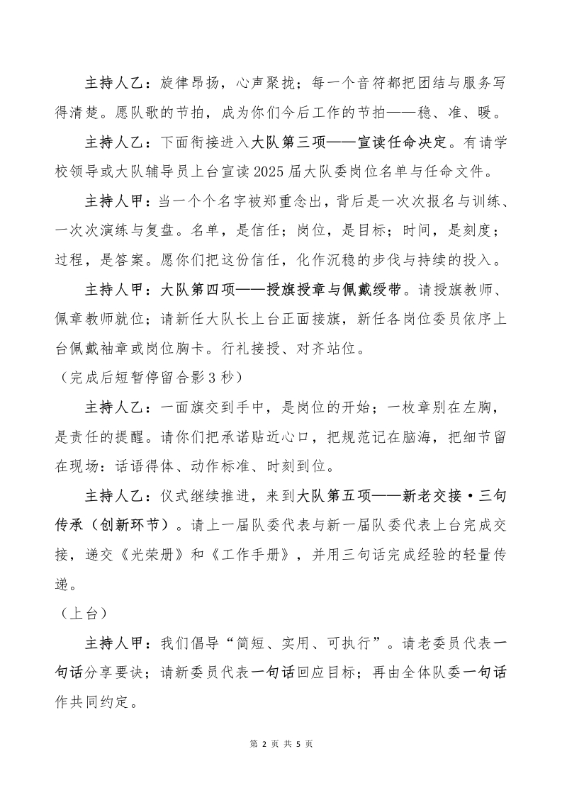 2025年大队委就职仪式主持词一小岗位托举大梦想红领巾伴我共成长主持人甲:清风拂槐影,书声映晨光;主持人乙:队旗一展,红色在胸前安放。主持人甲:尊敬的老师、亲爱的同学主持人乙:家长朋友,大家好!我们相聚队旗下,举行2025年少先队大队委就职仪式。从今天起,一枚袖章,一张岗位表,一次次到场与到位,将把少年的热爱与责任,稳稳落在校园的每一处角落。主持人乙:一条红领巾,是初心的颜色;一个小岗位,是成长的坐标。今天的仪式,不止是宣布与授予,更是承诺与出发:把理想写成清单,把时间写成节点,把行动写成纪要。温馨提示:请大家将通讯设备调为静音,摄影与走动尽量减量;队列保持安静有序,让整个大厅呈现庄重而友好的氛围。接下来,我们将依次推进每一个环节,愿每一步都清晰稳妥、温暖有光。主持人甲:现在,大队第一项一一出队旗、行队礼(队仪式)。请全体起立,出队旗一一敬礼!礼毕!主持人乙:举手敬礼,是对荣誉的致意,也是对日常的提醒:在走廊,在操场,在任何一个活动现场,我们都把礼仪摆在前、把秩序立在前、把安全放在前。愿这面旗,在今天照亮你们的名字,也在今后照亮你们的脚步。主持人甲:大队第二项一一齐唱《中国少年先锋队队歌》。请指挥与伴奏就位,全体齐唱。第1页共5页