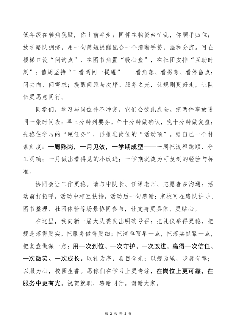 大队委就职仪式校长讲话稿一小岗位托举大梦想红领巾伴我共成长尊敬的各位老师、亲爱的同学们、家长朋友们:大家好!清风入场,队旗映光。我们在队旗下见证新一届大队委就职。就职,不止是被宣布的一刻,更是把热爱落到行动的开始一一把名字与岗位相连,把承诺与日常相连,把今天的掌声化成明天的一次次到位。第一束,是言行有度的礼仪之光。礼在眉眼,度在举止。请把问候放在开口第一句,把整洁落在出门第一步,把端正写在队礼的角度里。集合站位从容,指引语气温和,交流先听后答;在走廊轻声,在操场礼让,在台前沉稳。到岗提前五分钟核对流程与站位;提醒遵循三步法:轻声提示、示范动作、简要复述;活动结束当日小结,把要点记在册,把改进记在心。礼仪不喧哗,却能让秩序更顺、氛围更暖;一句“我来帮你”,一个侧身礼让,便是队员可被信任的名片。第二束,是稳步可依的规范之光。热情需要轨道,规范就是轨道。把“我想做”写成“我怎样做”,把“要做好”分解到“做到哪一步”。建议坚持一套简明做法:先把现场走一遍,心里有底;再把人和事捋一遍,分工有序;把节奏装进一张周表,大家对表往前走;事后回望一遍,把过程留痕,把改进写下。这样推进,不喧闹不拖沓,既看得见进度,也摸得着做法。今天的留痕,会成为明天的路径;今天的路径,会在这一学期沉淀成标准。第三束,是细处见暖的服务之光。服务不必张扬,常在微处发生:第1页共2页