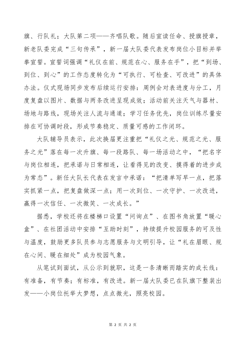 2025年大队委就职仪式新闻稿一小岗位托举大梦想红领巾伴我共成长9月30号,我校2025年少先队大队委换届工作按计划推进并顺利完成。活动坚持“公开、规范、有效”的原则,贯穿报名推优一知识笔试一海报展评一演讲答辩一结果公示一就职仪式全流程,既比能力、更比责任感与服务意识。本次竞选面向三至六年级少先队员开放,采取中队推荐与个人自荐相结合的方式。候选人按要求提交《大队委竞选申请表》、个人生活照与A3自制手绘海报,内容围绕“个人简介、特长事迹、岗位意向、服务承诺”。材料审核后,名单在校园公告栏与信息平台公示,接受全体师生监督。笔试环节聚焦队员应知应会与校园文明规范,涵盖《队章》《标志礼仪基本规范》《中小学生守则》等要点,统一命题、统一评阅。通过笔试的候选人进入复试,迈出从“热情参选”走向“能力上岗”的关键一步。复试环节包括手绘海报展评、竞选演讲与现场答辩,才艺展示为自选加分项。演讲要求围绕“我能做什么、如何做、做到什么标准”,答辩聚焦组织协同、秩序维护、安全预案、学习与岗位平衡等情境问题。评审组由学校与年级代表、师生代表组成,使用评分表打分并现场复核签字,确保过程可追溯、结果可说明。海报展评同步开展线下观摩,线上点赞仅作参考分,倡导理性、公正的评价氛围。在就职仪式上,庄严的队仪式开启新征程:大队第一项一一出队第1页共2页