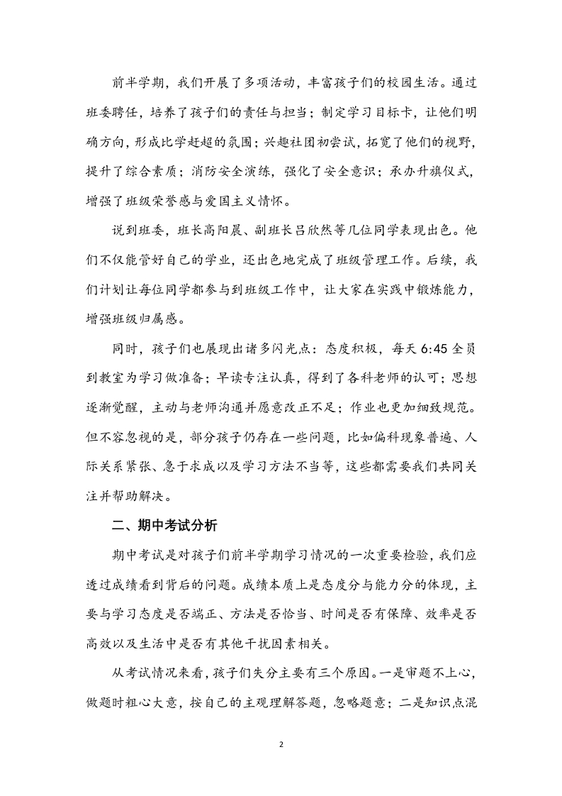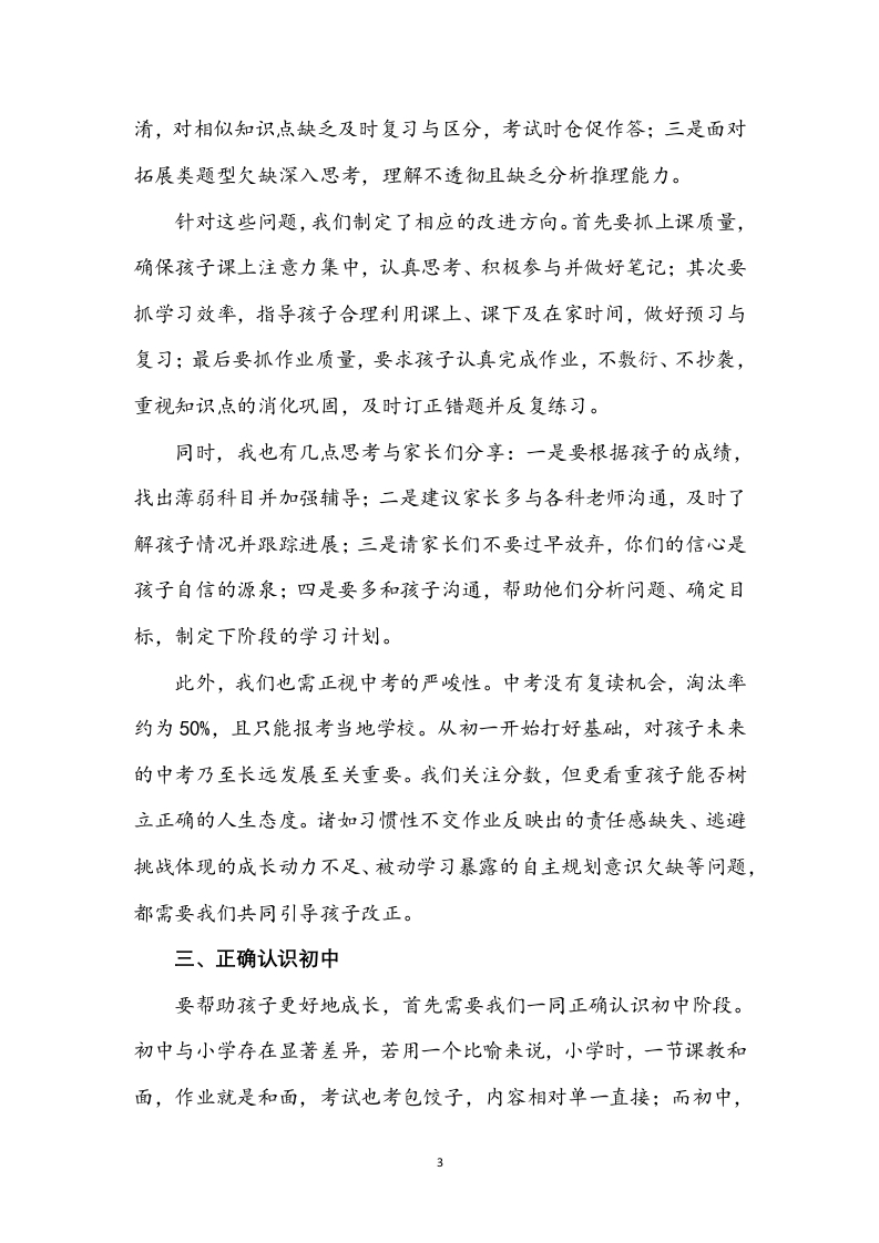 家校共赴诗与梦,育见花开向晴空一七年级上学期期中家长会尊敬的各位家长:大家好!我是本班班主任秦老师。欢迎各位在百忙之中莅临本次2025-2026学年度第一学期初一期中家长会,本次家长会的主题是“家校共赴诗与梦,育见花开向晴空”。接下来,我将围绕前半学期回顾、期中考试分析、正确认识初中以及助力孩子成长这四个方面,与各位家长展开交流,希望能凝聚家校合力,为孩子们的成长保驾护航。一、前半学期回顾首先,让我们一同回顾孩子们进入初中以来的这段时光。我们是七(3)班,共有53名学生,其中男同学31名,女同学22名。从刚入校时的懵懂,到如今逐渐成长为积极阳光、目标清晰、热爱集体、关心同学的初中生,孩子们的进步有目共睹。在日常学习中,我们有着固定的节奏:早间读7:10开始,早读7:45进行,12:15午餐,13:05至14:05是午休时间,14:15正式上课,16:55开展课后服务,18:10放学。晚自习从19:30开始,21:30结束。规律的作息为孩子们的学习提供了稳定的保障。孩子们的成长离不开一支优秀的教师团队。语文李老师沉稳且才华横溢,数学朱老师率真且认真努力,历史蒋老师博古通今,英语徐老师踏实肯干,地理钟老师智慧千练,道法肖老师兼具美丽与思想,体育王老师颜值与实力并存,生物刘老师教学灵活且干货满满。各位老师都在各自的岗位上用心教导孩子,助力他们的学业发展。