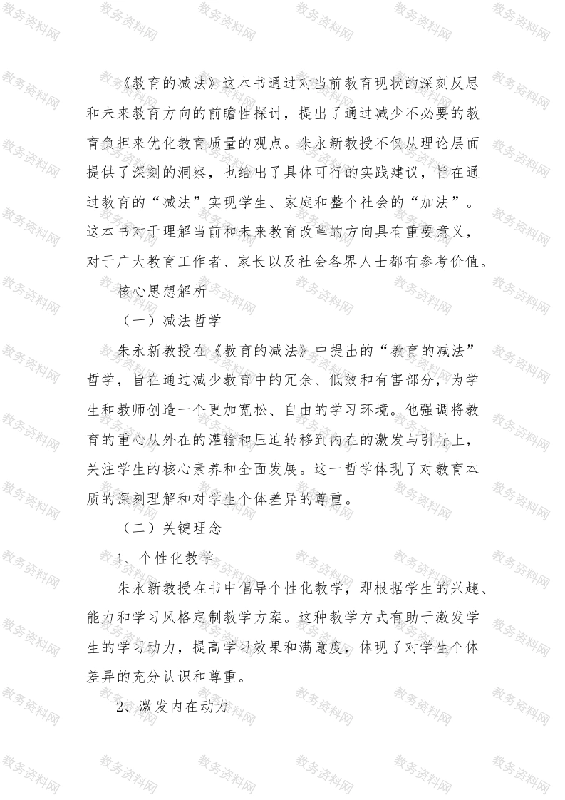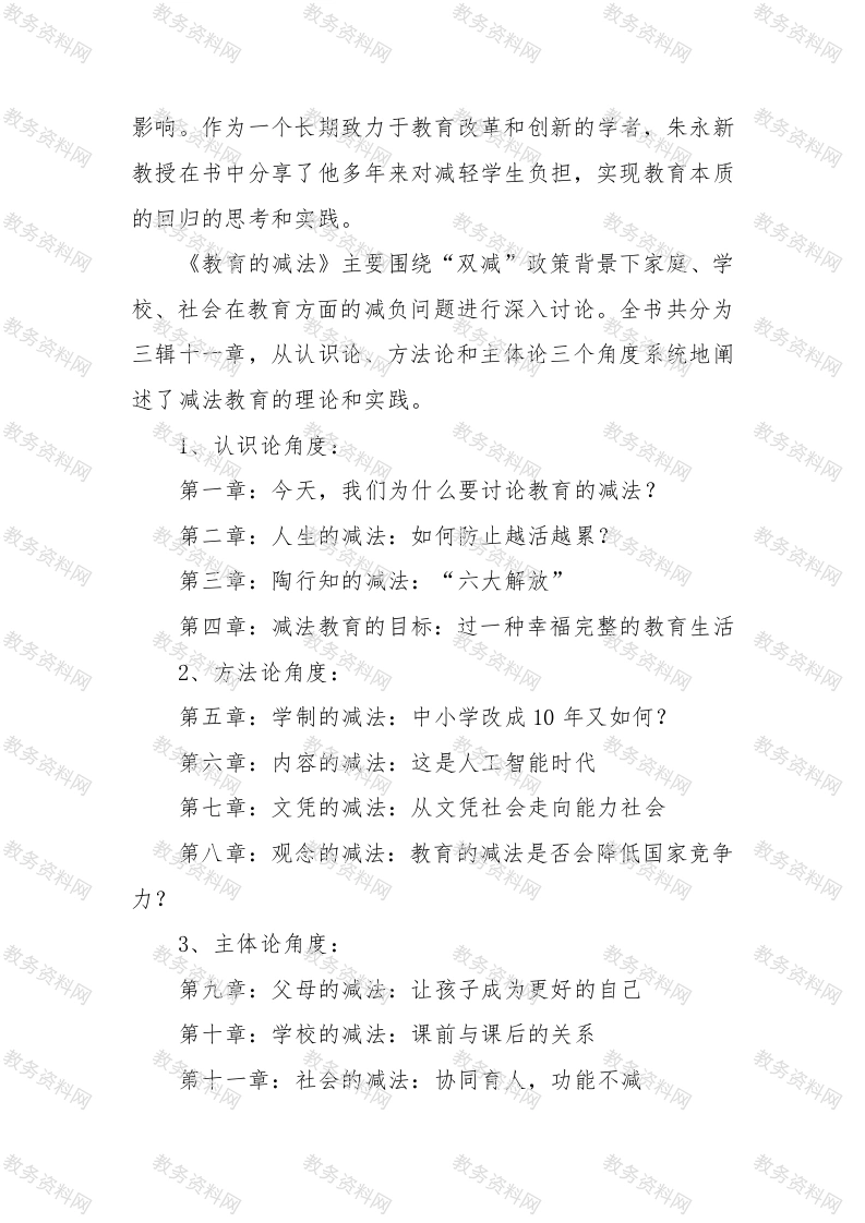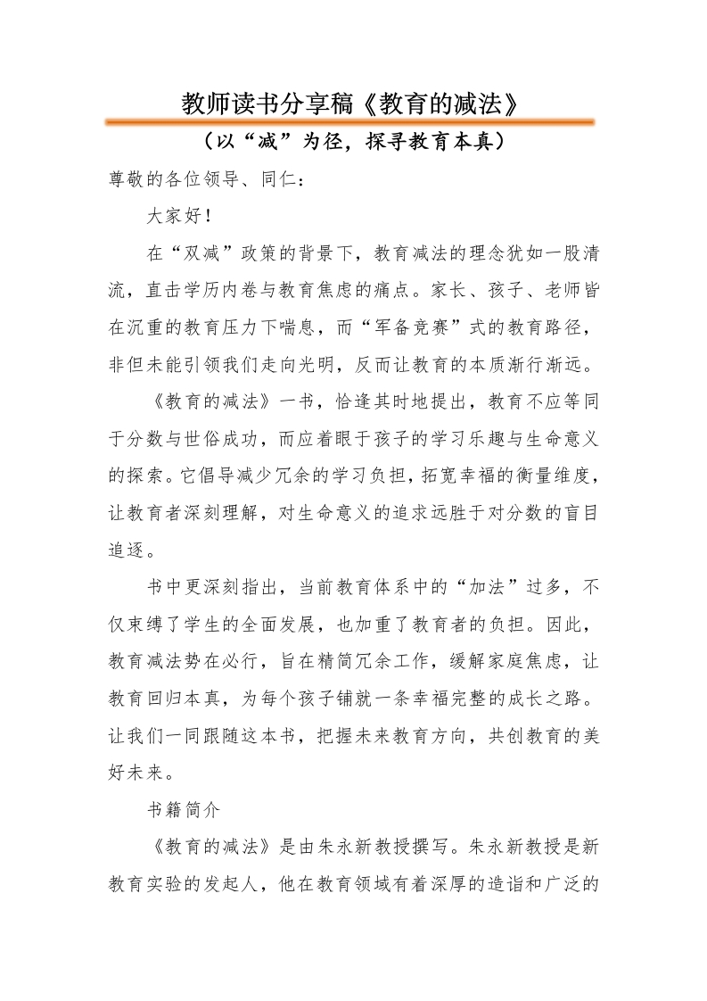 教师读书分享稿《教育的减法》(以“减”为径,探寻教育本真)尊敬的各位领导、同仁:大家好!在“双减”政策的背景下,教育减法的理念犹如一股清流,直击学历内卷与教育焦虑的痛点。家长、孩子、老师皆在沉重的教育压力下喘息,而“军备竞赛”式的教育路径,非但未能引领我们走向光明,反而让教育的本质渐行渐远。《教育的减法》一书,恰逢其时地提出,教育不应等同于分数与世俗成功,而应着眼于孩子的学习乐趣与生命意义的探索。它倡导减少冗余的学习负担,拓宽幸福的衡量维度,让教育者深刻理解,对生命意义的追求远胜于对分数的盲目追逐。书中更深刻指出,当前教育体系中的“加法”过多,不仅束缚了学生的全面发展,也加重了教育者的负担。因此,教育减法势在必行,旨在精简冗余工作,缓解家庭焦虑,让教育回归本真,为每个孩子铺就一条幸福完整的成长之路。让我们一同跟随这本书,把握未来教育方向,共创教育的美好未来。书籍简介《教育的减法》是由朱永新教授撰写。朱永新教授是新教育实验的发起人,他在教育领域有着深厚的造诣和广泛的