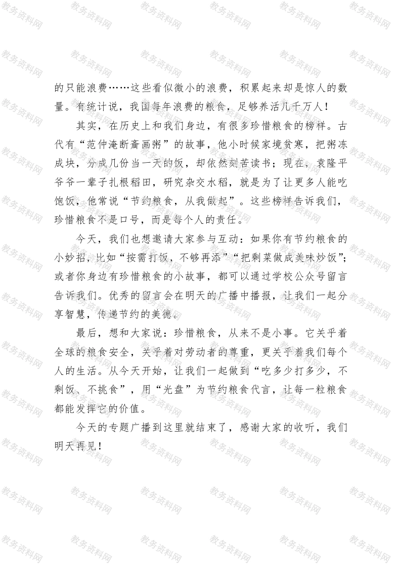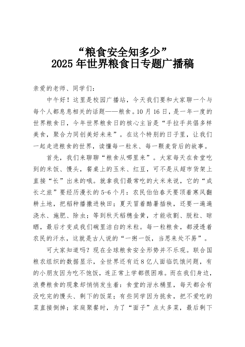 “粮食安全知多少”2025年世界粮食日专题广播稿亲爱的老师、同学们:中午好!这里是校园广播站,今天我们要和大家聊一个与每个人都息息相关的话题一一粮食。10月16日,是一年一度的世界粮食日,今年世界粮食日的核心主旨是“手拉手共倡多样美食,聚合力同创美好未来”。在这个特别的日子里,让我们一起走进粮食的世界,读懂每一粒米、每一颗麦背后的故事。首先,我们来聊聊“粮食从哪里来”。大家每天在食堂吃到的米饭、馒头,餐桌上的玉米、红豆,可不是从超市货架上直接“长”出来的哦。就拿我们最常吃的大米来说,它的“成长之旅”要经历漫长的5-6个月:农民伯伯春天要顶着寒风翻耕土地,把稻种播撒进秧田;夏天冒着酷暑插秧,还要一遍遍浇水、施肥、除虫;等到秋天稻穗金黄,才能收割、脱粒、晾晒,最后才变成我们碗里洁白的米粒。每一粒粮食,都浸透着农民的汗水,这就是古人说的“一粥一饭,当思来处不易”。可大家知道吗?现在全球粮食安全形势并不乐观。联合国粮农组织的数据显示,全世界还有近8亿人面临饥饿问题,有的小朋友因为吃不饱饭,连正常上学都很困难。而在我们身边,浪费粮食的现象却悄悄发生着:食堂的泔水桶里,每天都会有没吃完的馒头、剩下的饭莱;有些同学因为挑食,把不爱吃的菜直接倒掉;家庭聚餐时,为了“面子”点太多菜,最后剩下