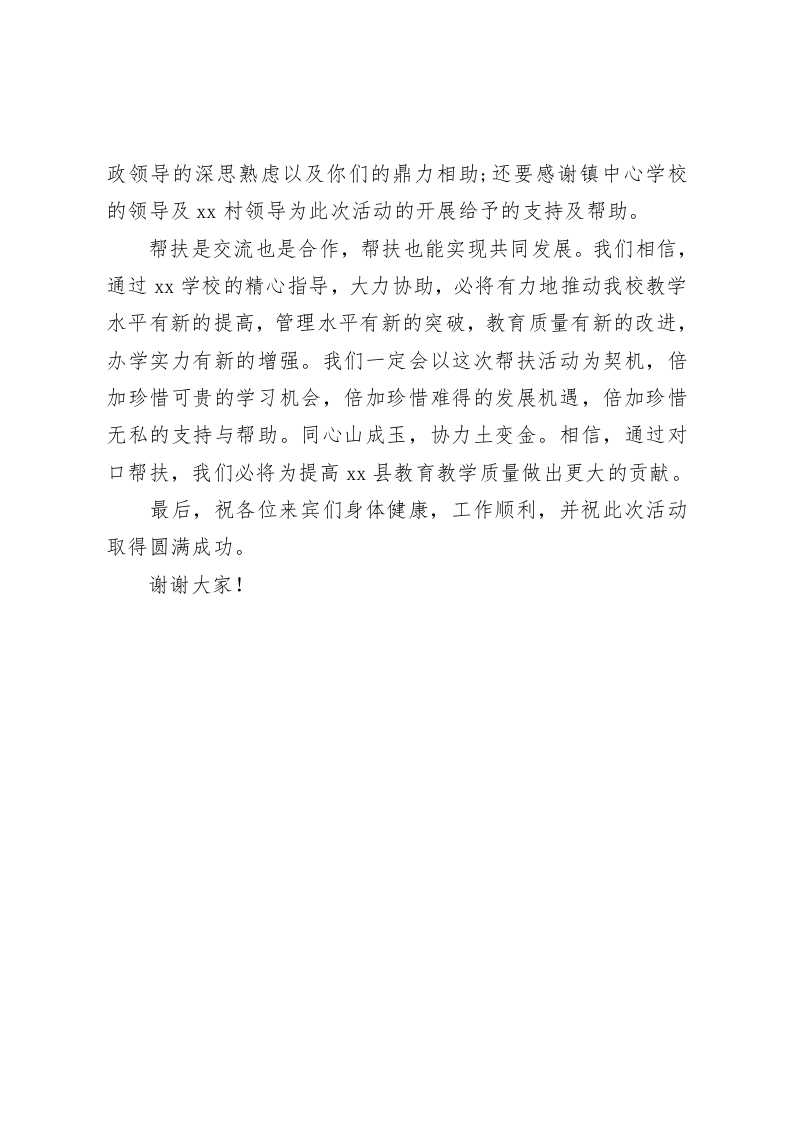 城乡互联,结对共建活动,校长讲话帮扶是交流也是合作,帮扶也能实现共同发展尊敬的各位领导、各位同仁:上午好!在这充满着丰收喜悦的美好季节里,我们齐聚一堂,在这里举行xx学校与Xx学校“城乡互联,结对共建”启动仪式。在此,我代表xx学校全体师生向出席今天活动的所有领导及同仁们致以衷心的感谢和最热烈的欢迎!xx学校,是我县xx城区的一所基础设施完善,办学条件优越,师资力量雄厚、教学成果丰硕的高水平、有特色小学。xx学校是位于我县Xx镇xx桥村的一座小学校。几经周折,原本属于拆并学校之列的xx,在各级各部门领导的关心支持下,特别是xx桥村支两委的大力支持和帮助下才得以保留。近年来,学校在硬件设施上有了长足提高,办学条件不断改善,但由于受到过去经济条件的制约和影响,学校的基础设施建设、办学水平还有待提高,师资结构还欠合理,难以满足社会对教育发展的需要。为缩小城乡教育差距,促进城乡教育均衡发展,推进教育公平,县教育局安排xx学校与我校开展城乡学校结对共建工作。在这里,我代表Xx学校全体师生衷心感谢县教育局为我们搭建这一平台;感谢在座的各位领导、同仁们拨冗光临,见证我校与xx学校结对联盟的历史时刻;更要感谢xx学校x校长和全体行