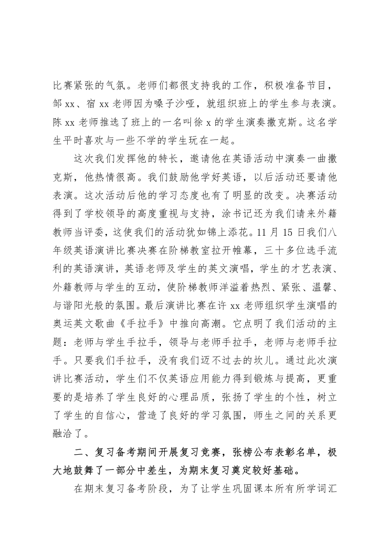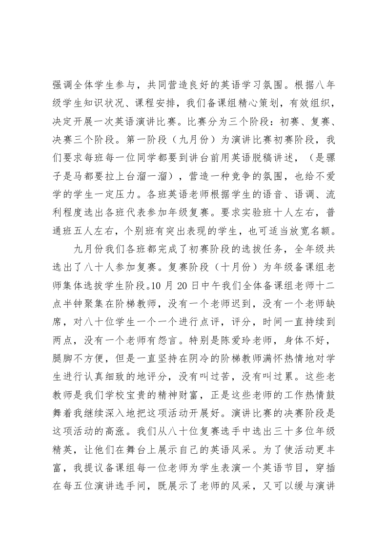 初二年级(八年级)英语备课组长发言让老师更好地为学校教学工作服务各位领导、各位老师:下午好!首先我非常感谢学校领导能给我一次发言的机会,让我在这里交流以下本学期我们八年级英语备课组开展工作的情况。我们八年级英语备课组是一个有着老、中、青三个年龄层的九位老师组成的团体。年长老师里有德高望重的陈xx、邹xx、刘xx等老师,年青老师里有踏实肯干的杨xx、陈x等青年教师。我们备课组全体老师团结一致、通力合作,在教学上采取了一些有效措施、组织了一些有意义的活动,感觉有一些收效。一、培养学生学习兴趣,营造学习氛围,给优等生、进步生提供展示自己的舞台。我们八年级是一个分化的年级,人多(接近xx人)、班多(14个班)、班额大(实验班都达到60人),年级里由于家庭原因产生的“问题生”较多,这些问题生营造“不学”的氛围,游离在家庭与学校之间,对老师的课堂管理造成不良的影响。我们英语学科是学生较为困难的学科,如果不消除这种不良影响,英语学科所遭受的负面影响将会更重。我们备课组在本学期初把培养学生学习兴趣、营造良好的学习氛围,给优等生、进步生提供展示自己的舞台作为备课组工作的重点。为了激发学生学习热情我们以“组织英语活动”为突破口,