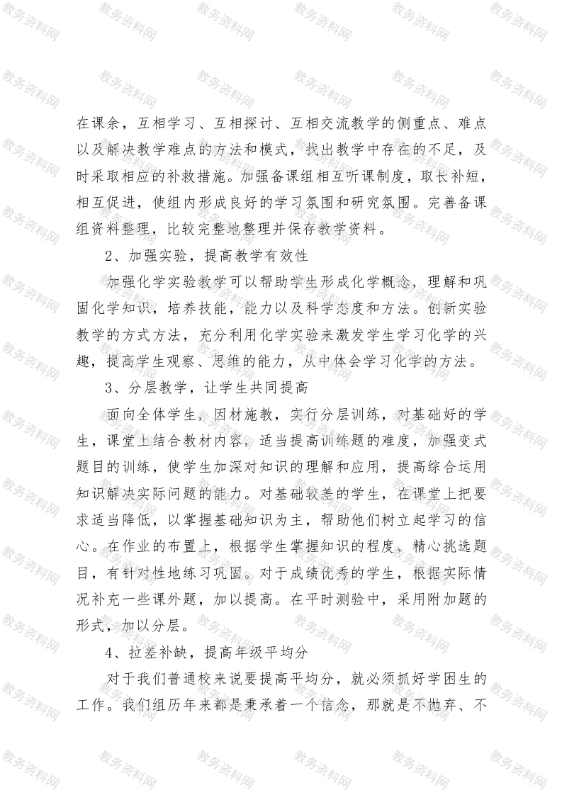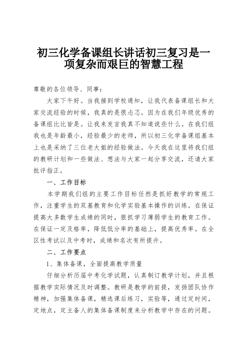 初三化学备课组长讲话初三复习是一项复杂而艰巨的智慧工程尊敬的各位领导、同事:大家下午好。当我接到学校通知,让我代表备课组长和大家交流经验的时候,我真的是很忐忑。因为在我们年级优秀的备课组比比皆是。让我来发言我真不知道说些什么。在我们组我也是年龄最小,经验最少的老师,所以初三化学备课组基本上也是采纳了三位老大姐的经验做法。今天我在这里将我们组的教研计划和一些做法、想法与大家一起分享交流,还请大家批评指正。一、工作目标本学期我们组的主要工作目标任然是抓好教学的常规工作,注重学生的双基教育和化学实验基本操作的训练。在保证提高大多数学生成绩的同时,狠抓学习薄弱学生的教育工作。在保证一定及格率,降低低分率的基础上,提高优秀率。在全区性考试以及中考时,成绩和名次有所提升。二、工作要点1、集体备课,全面提高教学质量仔细分析历届中考化学试题,认真制订教学计划,并且根据教学实际情况及时调整。教研是教学的前提,发扬团队协作精神,加强集体备课,精选课后练习,实验等,通过定时间,定地点,定主备人的集体备课制度来分析教学中存在的问题。