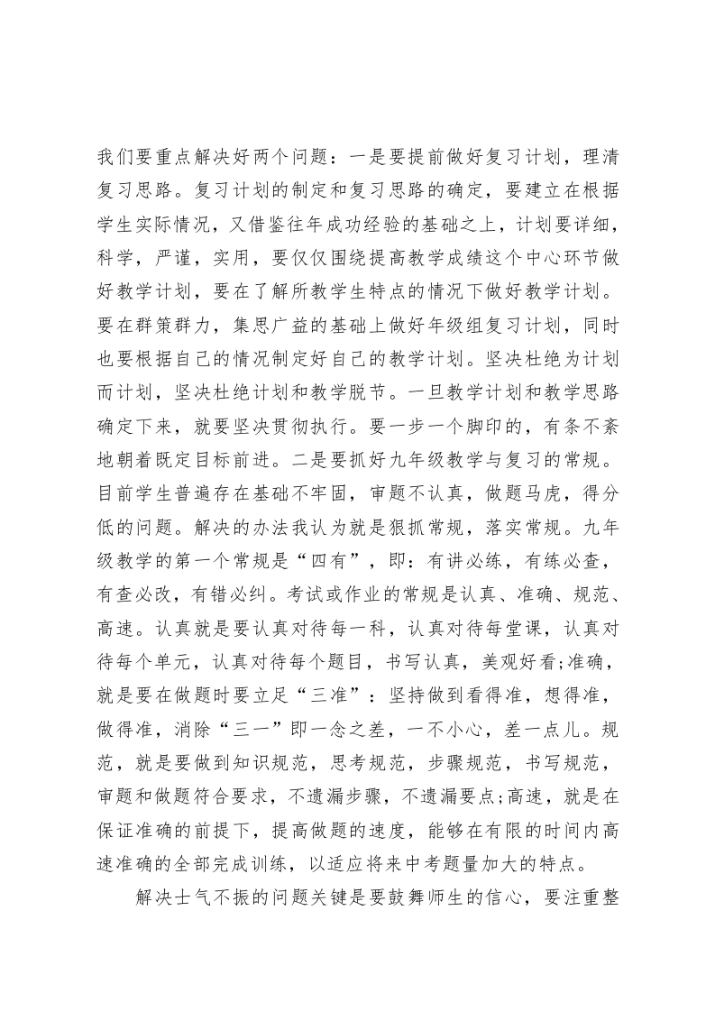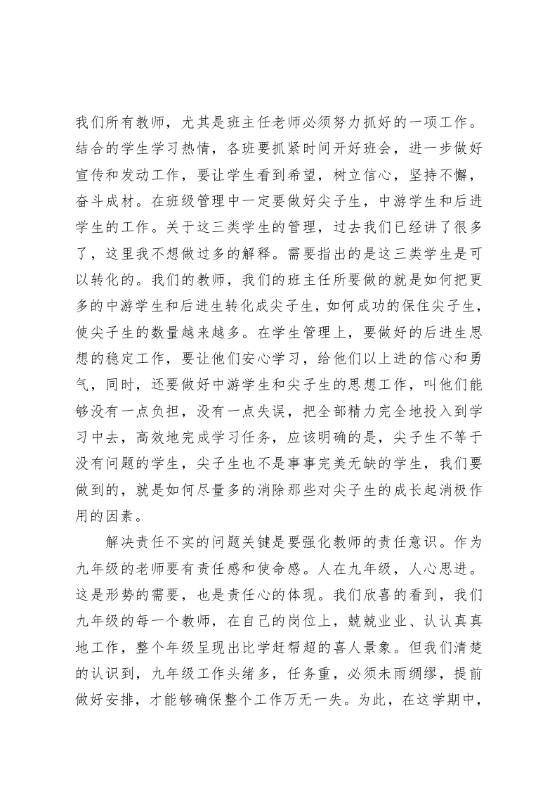 初三教师会上,校长讲话九年级是展示才智的地方,九年级是劳心劳力的老师们!在这里我强调一下,学校管理中,不可避免地要面对那些学习成绩和道德品质都不好的学生,他们无视纪律,不服从管理,屡教不改,个别的成为班级的害群之马,对于他们,学校绝对不心慈手软,要严肃处理。九年级不同于其他年级,老师们没有过多的时间和精力,用在那些视纪律如儿戏的学生身上,对于他们,假如不能够安心学习,不能够做到服从管理,就必须严肃处理。严肃处理学生,老师没有错。希望班主任放心大胆地抓管理,学校将全力支持大家的工作。另一方面我们也要注意站在学生的角度想问题,要多鼓励学生,要善于发现学生的优点和闪光点。俗话说:“做成功的老师,教自信的学生。”教师要更多想到学生可爱的一面,成功的一面,生动的一面,不要动不动就批评指责学生。千万不要做挫伤学生自尊心自信心的事。关于九年级的工作大家谈了很多,我认为,管理不善,责任不实,士气不振是去年统考考得不理想的原因。我们要针对这些问题寻找解决的办法。解决管理不善的问题关键是要加强班级管理,加强学生管理。班级工作一向是学校教育工作的着眼点和落脚点,班级工作的好坏直接影响到教学成绩的好坏,所以,班级工作应该是
