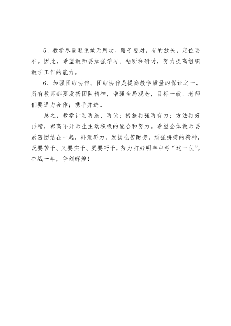 初三教师会议上,校长保证中考奖励制度一定兑现各位老师:下午好!听了老师们的想法,我知道,我们的老师花了很多心思,动了很多脑筋,还好,大家都很有信心,这一年我们要背水一战,这关系到学校的生存问题。我在这表个态,虽然我们这个家庭经济条件不理想,但我保证中考奖励制度一定兑现。后勤保障想办法跟进,只要我们心往一处想,劲往一处使,学校的的前景是光明灿烂的。初三年级工作是学校工作的重中之重,为了使我校本届初三年级能取得更好的成绩,我们本着实事求是、对症下药、提高效率的原则,经过调查研究、深思熟虑,在教师的大力协助下,确立了我们自己的教学思路。一、认清形势,负重前行。因地域、生源等原因,我们的学生基础相对来说是比较薄弱的,从现定的目标的情况来看(保二争四争五),是有困难的,我们应该有信心也有决心在中考中取得较好的成绩。希望全体教师要全力以赴、鼓足信心、负重前行,要通过一年的学习,扬优补劣、取长补短。在这最后一年的黄金时间里,力争提高教学质量,提高教学效率,赢得中考的全面胜利。二、注重实效,科学教学。