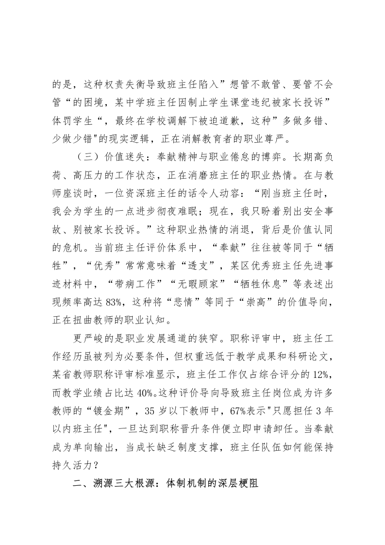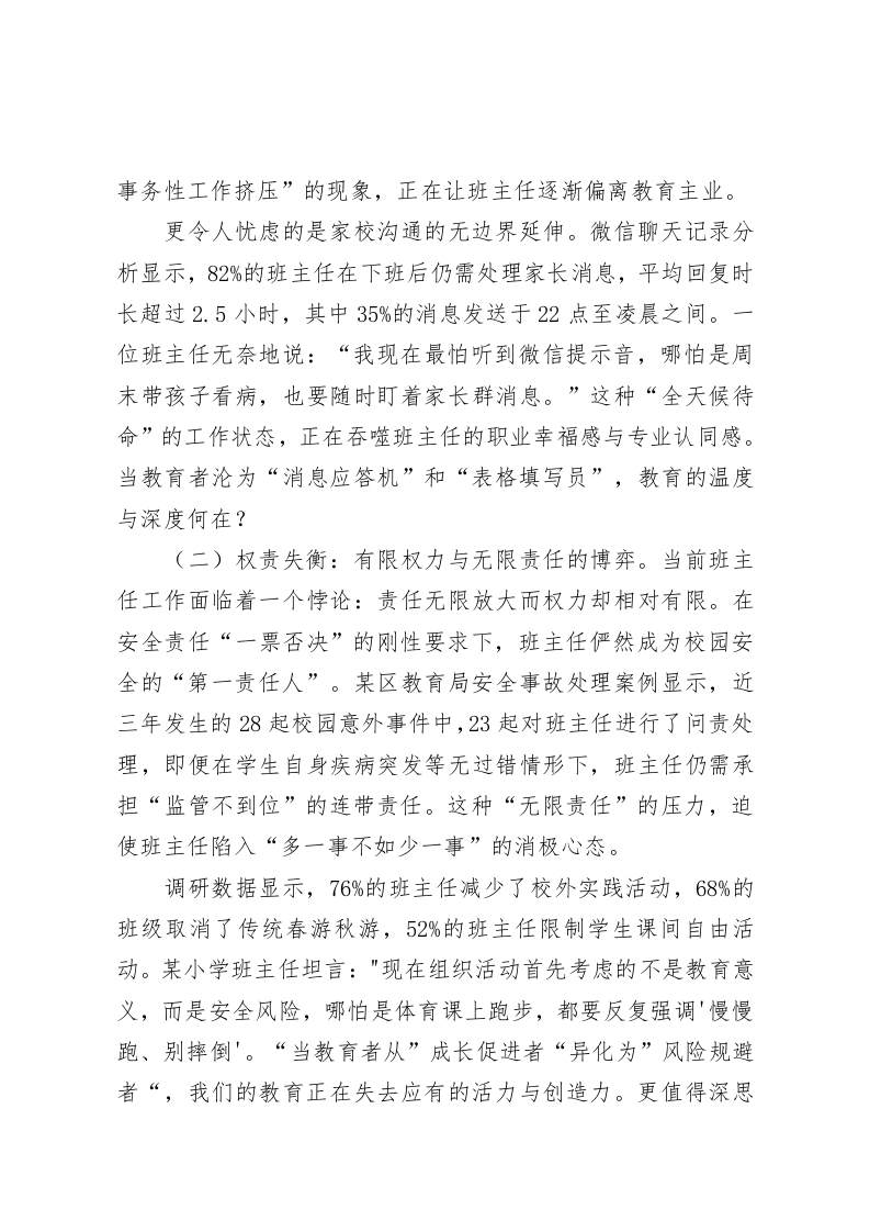 校长在全市学校管理经验交流会上的发言:困境突围与价值重塑尊敬的各位教育同仁:大家好!今天,我们站在教育改革的关键节点,共同探讨一个关乎教育根基的核心命题。近期,一份班主任工作日记在教育圈引发热议:“清晨六点的校园,我是学生的守护者;深夜十点的灯光,我是家长的应答者;全年无休的日历,我是事务的处理者。”这段文字背后,折射出班主任群体“戴着镣铐跳舞”的现实困境。作为连接教育方针与学生成长的重要纽带,班主任队伍建设直接关系到立德树人根本任务的落地生根。今天,我将从困境剖析到路径探索,与各位同仁共同寻找班主任队伍建设的破局之道,让教育回归本真,让师者重拾初心。一、解构三重矛盾:班主任工作的现实困境(一)角色冲突:教育者与事务员的身份博弈。在理想与现实的夹缝中,班主任正经历着深刻的角色撕裂。一方面,教育初心呼唤他们成为学生成长的引路人,需要潜心研究教育规律,精心设计班级活动,耐心开展个别辅导;另一方面,繁杂事务却将他们捆绑为行政体系的末端执行者,我校调研显示,班主任日均处理行政事务达13项,包括数据填报、材料整理、会议记录等,占工作总时长的61%。某初中班主任的工作台账显示,他一周内完成了7份安全报告、5项数据统计、3场专题会议,而与学生个别谈心的时间不足3小时。这种“教育时间被